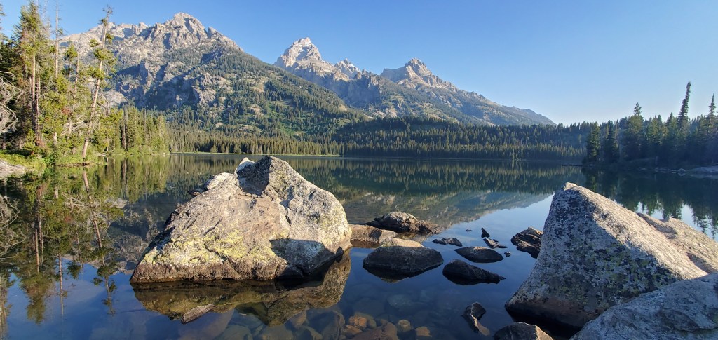 Taggart Lake Trailhead is the first parking lot you encounter as you drive into the park. When I arrived just after sunrise, there were only a few other cars in the lot. Traveling alone, I actually was hoping for more people so that I could have some bear protection, but I decided that I would just have to sing as I hiked to keep them at bay – and it seemed to work. My apologies to the bears and any other hikers that had to listen to my lovely singing voice. The 3 mile loop takes you by some beautiful vistas of the Grand Tetons as well as, of course, Taggart Lake. I’ve heard that you can swim here, but I’ve heard the water is pretty cold, and since it was early morning when I did the hike, I was happy to just enjoy the morning light reflecting off the mountains and water.