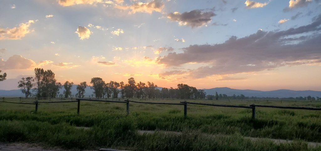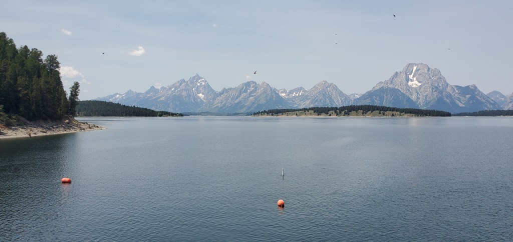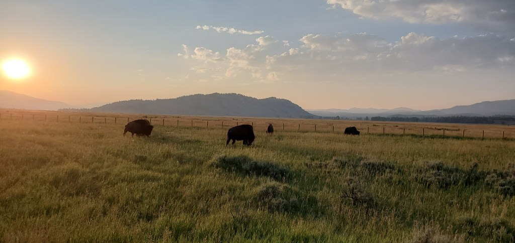 After the sunrise, my drive out of the Tetons gave me my first buffalo sightings for the trip – there would be many more to come in Yellowstone – and lovely views of the Snake River where I got to see people fishing, birds circling, and my final glimpse at the beautiful Teton range. Goodbye for now, hopefully.