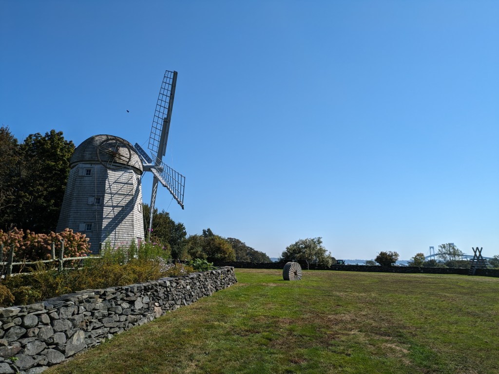 The first site that you come upon off the highway is the Jamestown Windmill. While the inside of the windmill is only open to the public during the weekends in the summer, the grounds of this historic site are open all year round. Built in 1787, the Windmill was originally used to mill corn. Since 1912 it has been maintained by the Jamestown Historical Society. The windmill sits next to current farmland with a view of the Newport bridge in the distance.