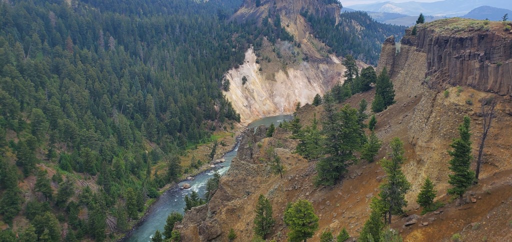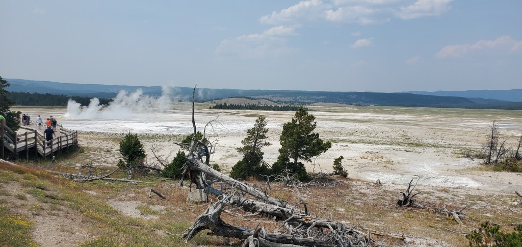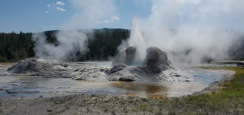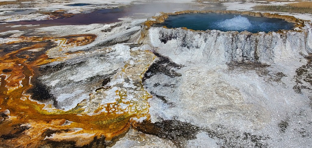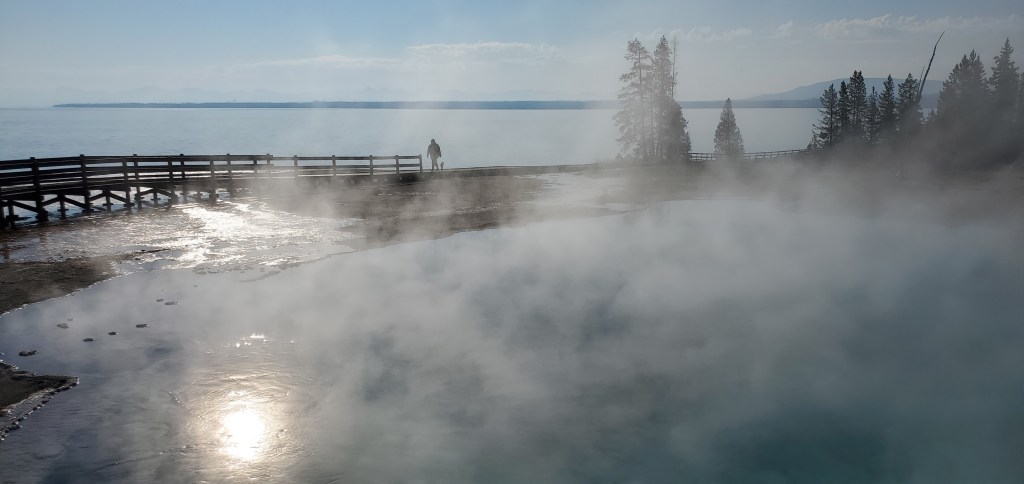 Coming from Grand Teton National Park, I entered Yellowstone from the south. Since my lodging was north of the park (in Gardiner), I decided that this was the day to explore the southern points of interest, which meant this was geyser day. I started with a morning walk at West Thumb. This accessible loop trail gives a nice introduction to geysers with a backdrop of Yellowstone Lake. Fun fact, Yellowstone Lake is the largest highest elevation lake in the United States. I liked the contrast between the heat of the geysers and the cold water – so cold that the NPS service says that people would only survive in its water for about 20 minutes.