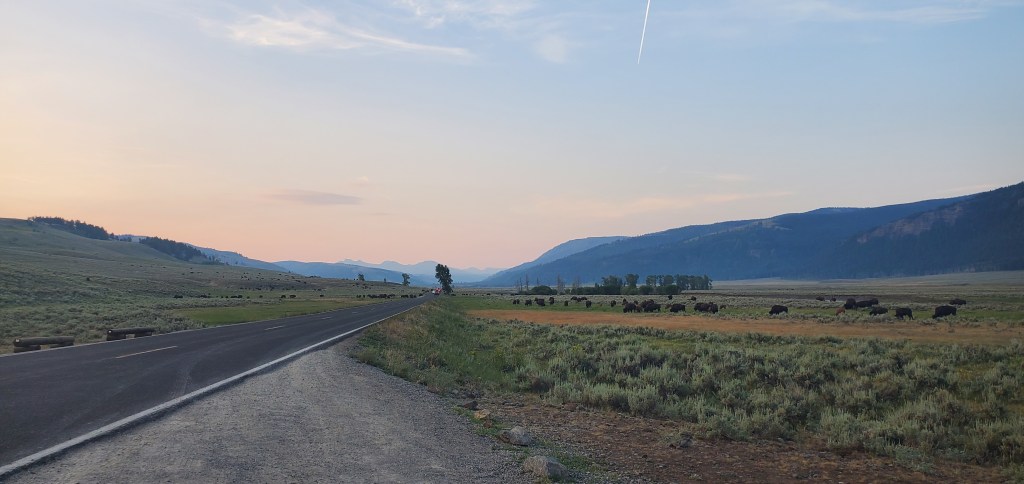 The next morning, I woke before the sun to make my way to Lamar Valley. While I didn’t have a telescope or professional camera, I enjoyed my breakfast watching the sun coming up over the mountains and the wild buffalo and elk roaming the lands. There was a collection of photographers trying to capture wolf activity from afar, but even though I couldn’t see the wolves, I could see the elk and deer fleeing from their presence.