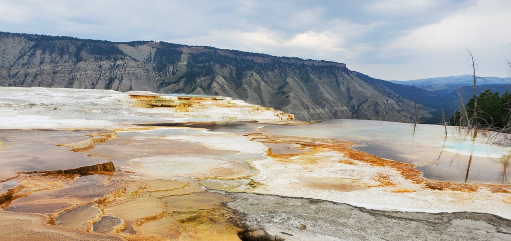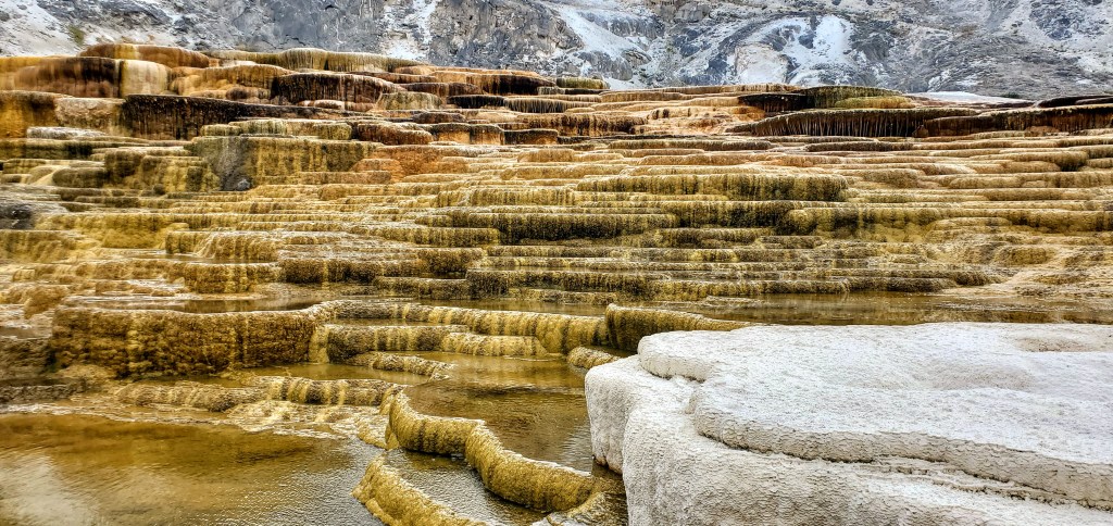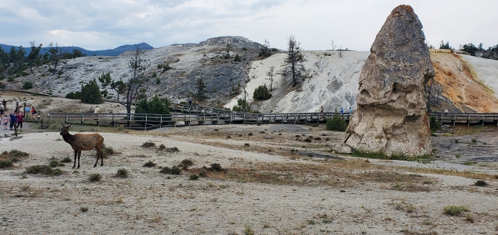 After my mid afternoon nap, my evening excursion for today was Mammoth Hot Springs. I was greeted outside of the Springs with the local elk and deer hanging out in the town square. From there, the layers of white limestone and the yellow travertine make this unlike other sights in the park. At the top of the Springs, the unearthly colors of the stone flats contrast with the view of the neighboring mountains.