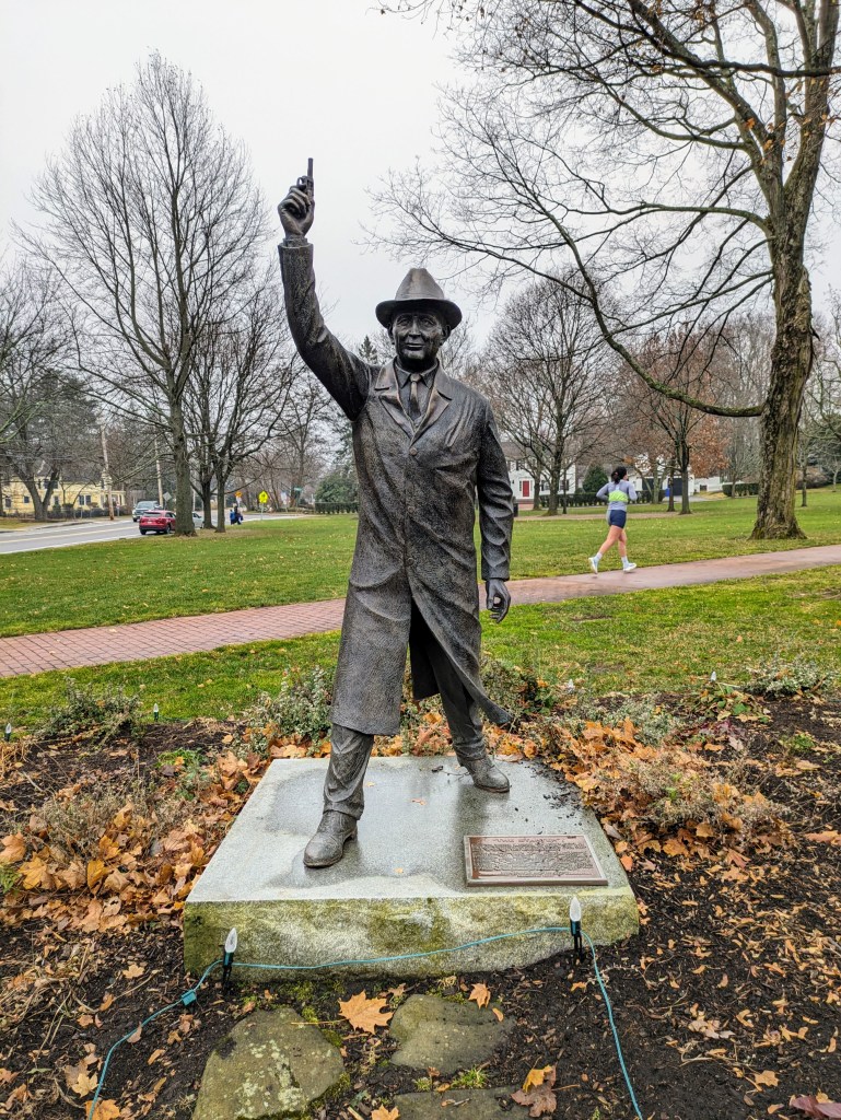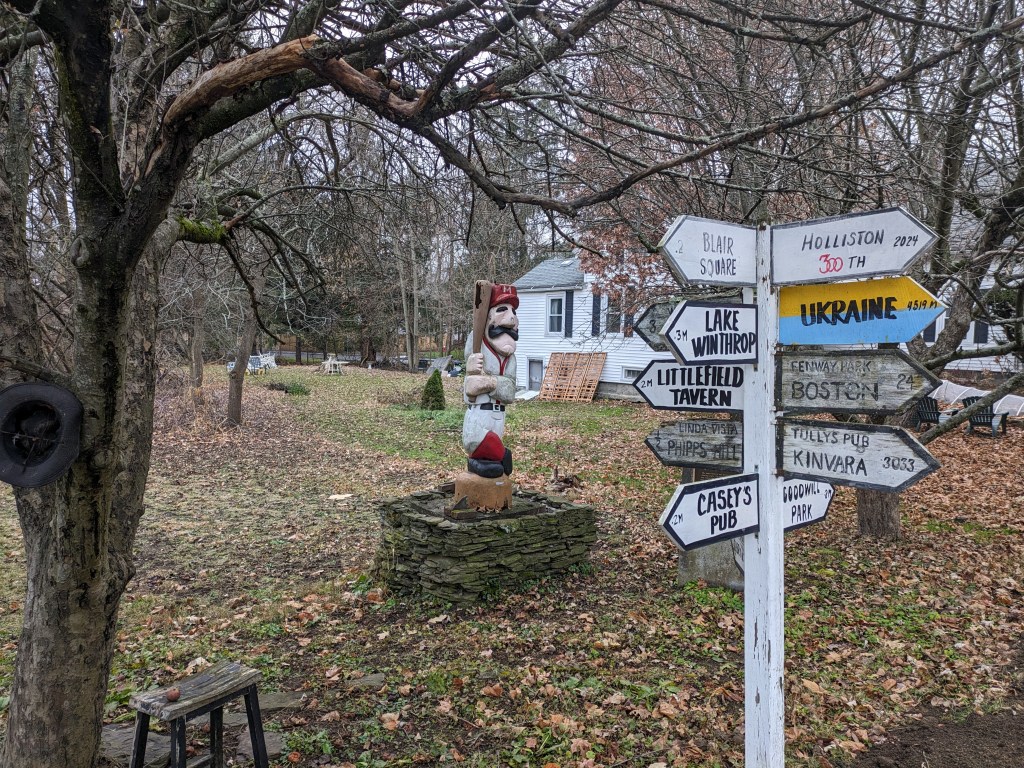 One of those plaques talks about “Casey at the Bat”. This 1888 poem by Ernest Thayer focuses on a fictional baseball team from Mudville. Mudville was the nickname for this area of Holliston, where Irish immigrants working at the nearby factories lived. The Mudville neighborhood is worth a walk around. Because the houses originally belonged to factory workers, they are small and close together. However, you can tell there is a strong sense of community here as the houses are all well kept with cute gardens, little free libraries, and designated sitting areas. Set within this neighborhood is a statue in honor of the poem & a memorial in honor of the Irish immigrants who settled the area.