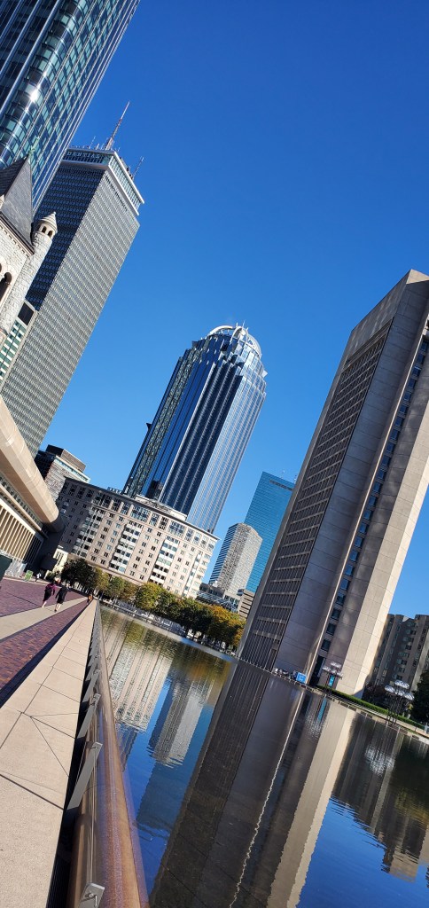 On the other side of the Prudential Center is Copley Square. In the summer months, with the fountain running, music playing, and food trucks out, Copley Square comes alive. It also hosts free concerts and festivals, including one of my favorites: the Boston Book Festival. The Square is surrounded by the Fairmont Copley Plaza Hotel, Trinity Church, the Boston Public Library, and Boylston Street. The contrast between the rough stone of Trinity Church, the mirrored glass of the John Hancock Tower, the smooth limestone of the Fairmont and library reflect the layered history of the city.