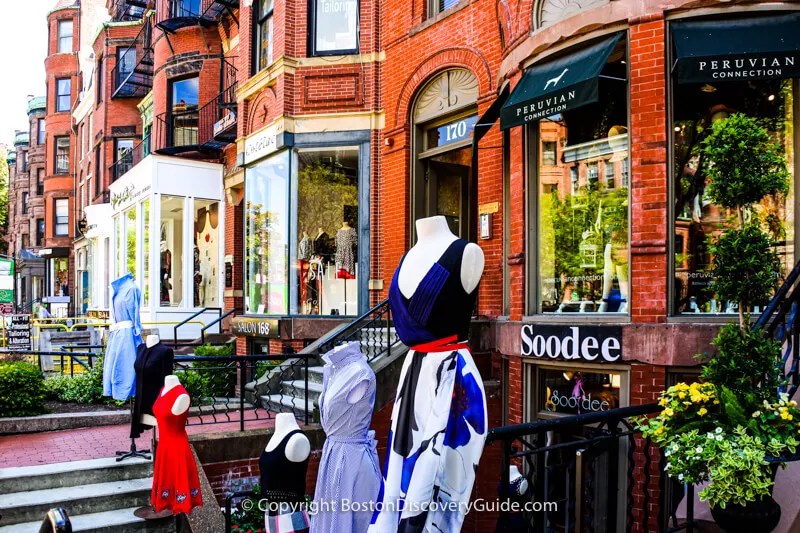 Most of the buildings on Newbury Street are three story brownstones. To get a better look at these iconic buildings, move over to one of the streets parallel to Newbury Street: Commonwealth, Marlborough, or Beacon. While the reddish-brown sandstone that gives these houses their names is not an expensive material, the history and location of these buildings has made these streets some of the most expensive real estate in the city.