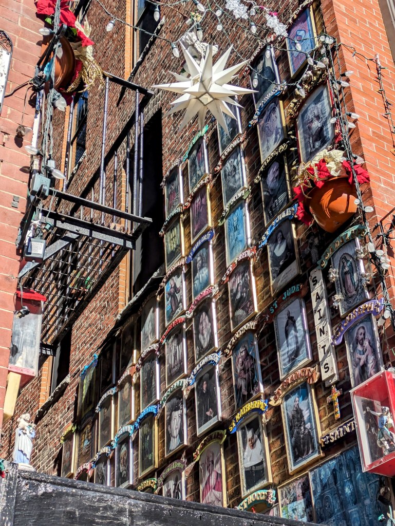 One of these interesting alleyways is All Saints Way. A local North End resident has decorated his private alley with shrines to Catholic saints. Resident Peter Baldassari has been adding to his shrine with handmade collages for over 30 years. When he’s around, he’s known to give tours of the shrines, but even with the gate closed, several are visible from the street.