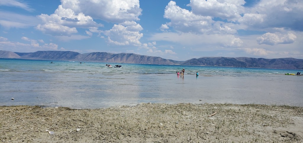Called the “Caribbean of the Rockies” because of the bright color that is produced by the sun reflecting off the limestone deposits in the lake, the 20 mile long Bear Lake draws boaters and swimmers from near and far. One of the best things I did on this road trip was to buy myself a cheap beach chair and umbrella so that I could sit and enjoy places like this. I joined several other groups who set up tents for the day on the white sand shores of the lake to wade in the shallows and swim in the freshwater. While I set aside two hours to enjoy the lake, I wish I had more time; I can imagine planning a whole vacation just to come here. The town of Garden City has a few restaurants and tourist stores to peruse as well.