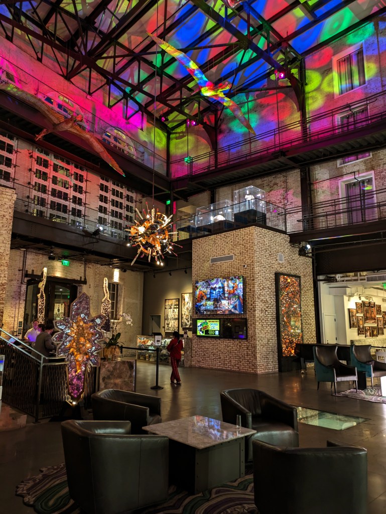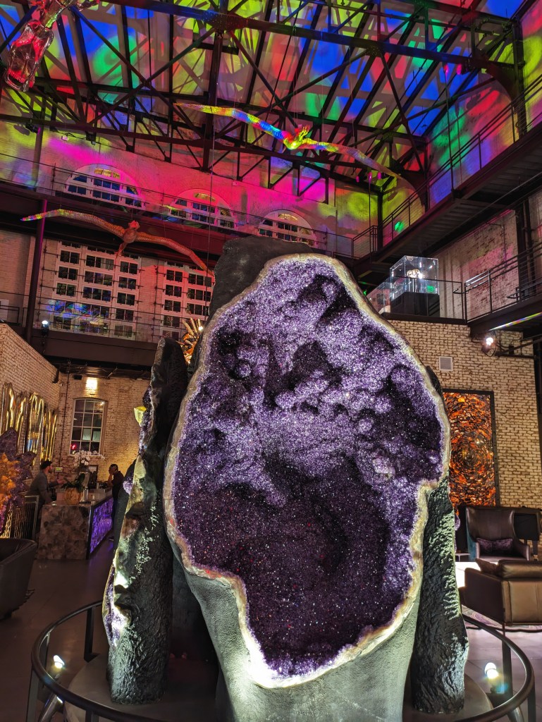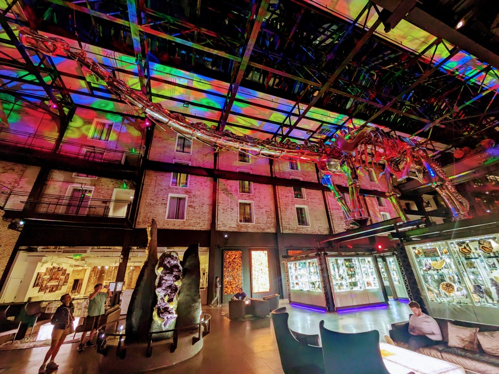 At first I thought that the Plant Riverside District would be a basic warehouse turned into a restaurant/shopping/nightlight space, so I was completely surprised by the shimmering colors that greeted me at the door. The interior is a two story open space with brick walls, and brass, iron and steel fixtures from the original power plant. Hanging from the ceiling is a metallic replica of the Maraapunisaurus (one of the largest dinosaurs to have been discovered), serving as a backdrop to the hotel desk are a pair backlit amethyst pieces that look like butterfly wings, and standing as sculptures in the middle of the space are 6 foot tall geodes (which are more than 4 million years old). Metallic colors and lights bounce off these installations making it hard to know where to look. Near the large geodes are videos and displays to learn more about the gems, dinosaurs, and the history of the power plant. There are also a few viewing boxes inserted in the floor designed to give people a glimpse of the original steel tracks used to cart coal into the factory. Besides being a feast for the eyes and a history lesson, the space includes small glass walled shops, art galleries, restaurants and bars..