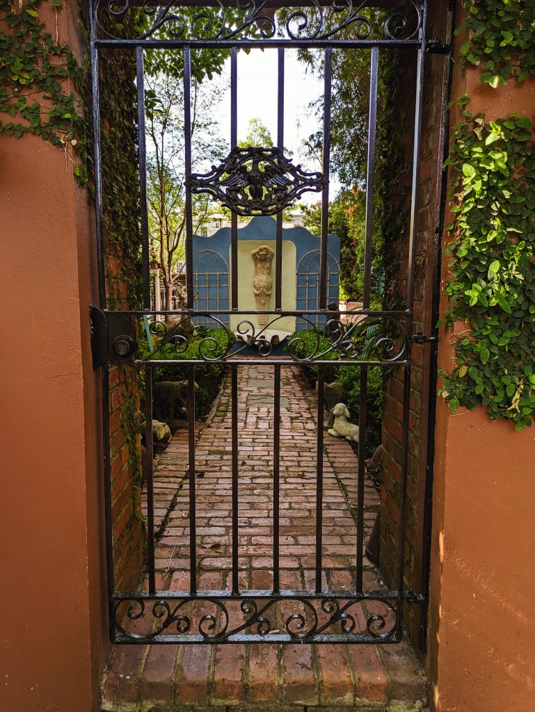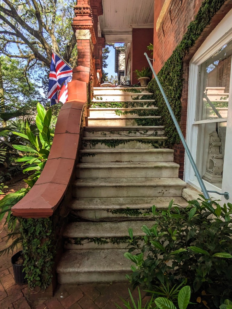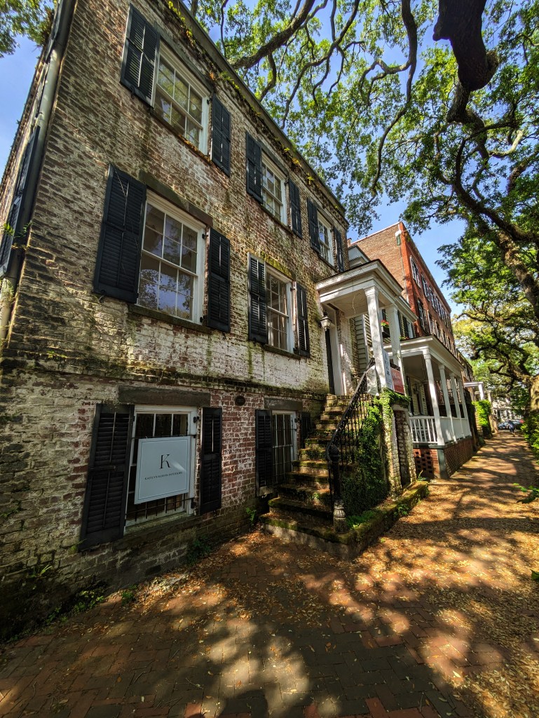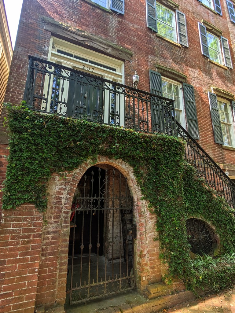 Another massive hit was just a few blocks north of Forsyth Park. While I had heard that Jones Street has been called “the Most Beautiful Street in America”, I didn’t know if it would live up to the hype. Located in the heart of the Historic District, the picturesque Jones Street definitely awed me with its beauty. The large Southern live oaks on either side of the red bricked street frame the space and make it feel like a world unto itself. Historic Colonial and Georgian homes rise up on either side with massive grand staircases that seem to separate the lay person from the world of the rich and powerful. At street level, all you can do is let your eyes follow the wrought ironwork and grand staircases to the formal entry porch and wonder at the glamor behind the doors. Instead of delicate flowers and landscaping, the houses are adorned with lush greenery that seems as historic as the homes themselves. The bright greenery creates a contrast with the redbrick of the wide sidewalks and walls of the homes. Some of the greenery even makes its way up the banister and risers of the staircases.