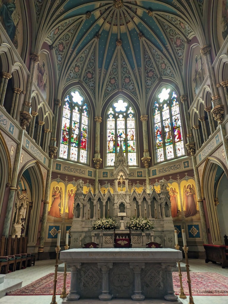 As you walk closer and closer, the twin spires and the marble stairs continue to climb into a sky not covered with oak trees. The contrast between the shade and coziness of Lafayette square and the bright and openness of the church almost blinds you and prepares you for a very different atmosphere. Inside this oldest Roman Catholic Church in Georgia (1876), the towering columns that lead to the many arched ceilings seem to be even higher. I don’t think I’ve ever been in such a grand church; however, the space is only overwhelming in its beauty. The calming blue of the ceiling, gold accents of the crosses and edges, and intricate details of the stained glass windows and painted murals all took my breath away.