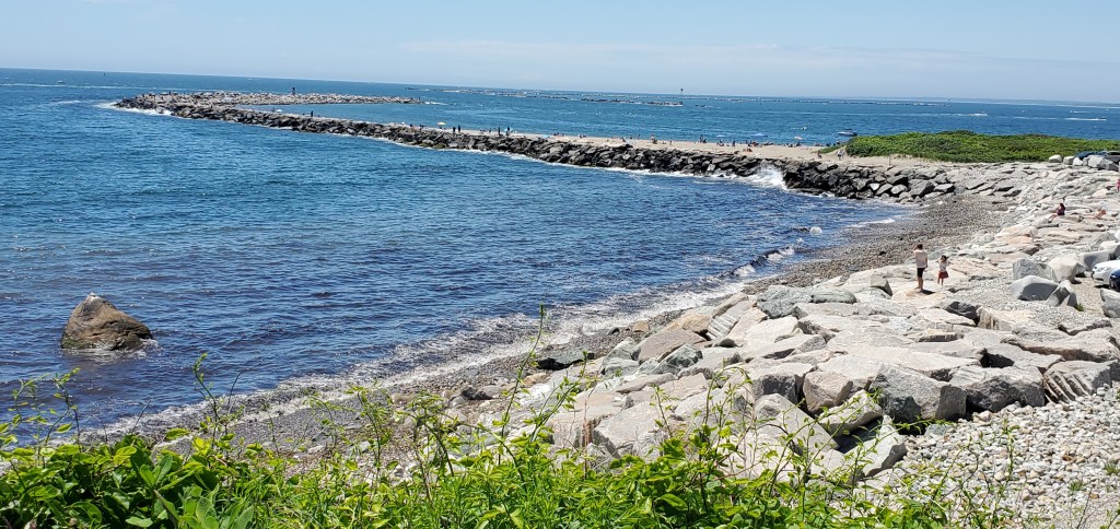I can’t go to the coast without finding at least one lighthouse to see. Point Judith Lighthouse sits at the entrance to Narragansett Bay. Since the lighthouse is on the grounds of an active coast guard base, it is not open to the public; however, there is a nice view of it from the Fisherman Memorial platform. The two tone brick facade of the octagonal lighthouse gives it visual interest against the blue of the water and sky. Additionally, next to the lighthouse, Camp Cronin fishing area offers a long walk out on the jetty and a small beach.