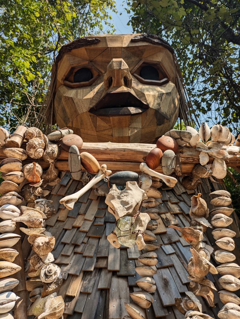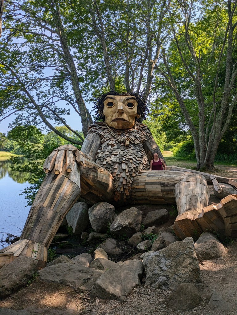 Ninigret Park has always had walking trails (Ninigret National Wildlife Refuge), and they provide some nice views of the water, but the addition of the Danish artist Thomas Dambo’s trolls this year (2024) have given this park something unique. I’ve been wanting to see his work up in Maine, but haven’t had a chance to go yet, so when I heard about these new sculptures, I knew that they were definitely going to be on my beach itinerary for this year. Ninigret Park is home to two of his upcycled trolls: Erik Rock and Greta Granite. Keeping in line with his mission, both trolls are made from recycled material from the area. Thus, Erik Rock is made out of burned maple branches, and Greta Granite is adorned with necklaces made out of shells, bones. The size of the sculptures give them an immediate visual impact, but what I was really impressed with is the attention to detail. For instance, Greta Granite is sitting on her knees; thus, her feet are behind her. It would be easy to make these feet an afterthought, but Dambo instead gave her arches. Supposedly there will be 18 of these Troll sculptures around Rhode Island by the end of Dambo’s exhibition, and I can’t wait to check out the rest of them.