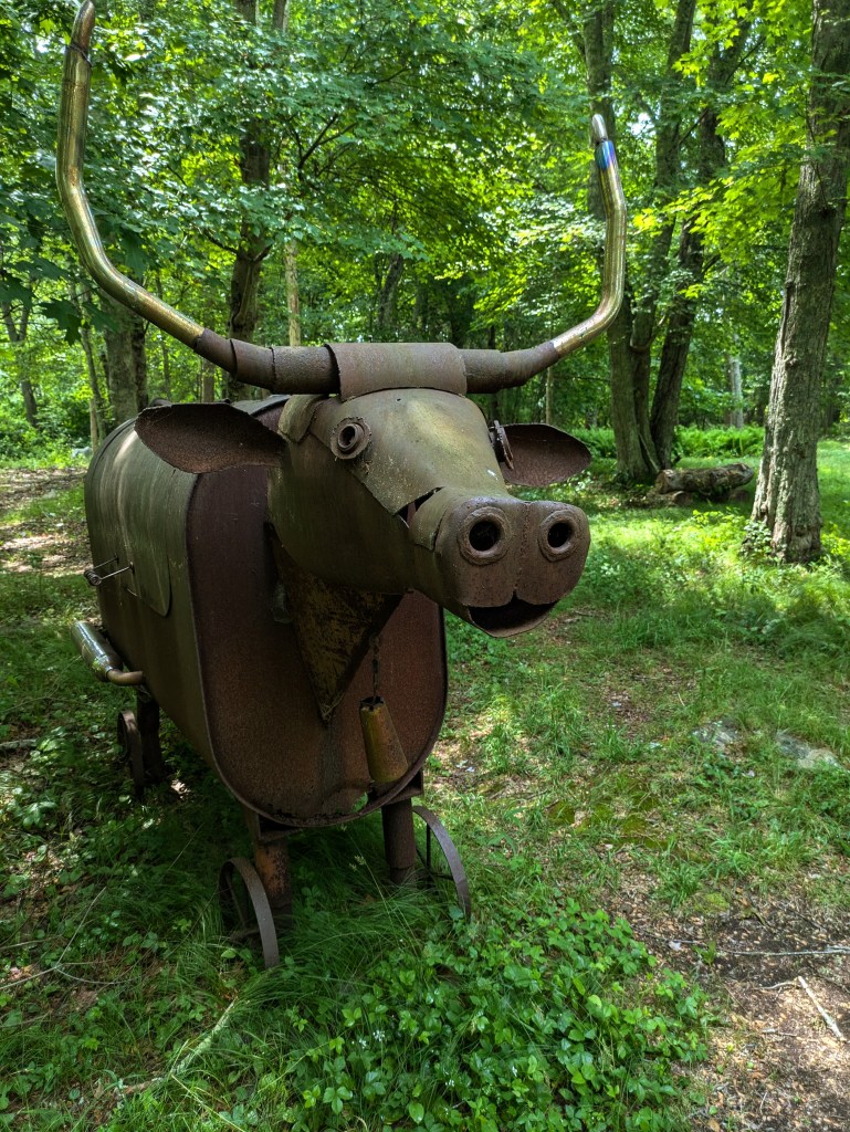 A much smaller and shorter art walk is the SKLT Sculpture Trail. Part of the South Kingstown Land Trust, this three acre wooded area sits at the corner of a residential street. While the trail is hard to see from the road – especially if you didn’t know it was there – the giant rusted red cow that stands at the entry to the trail will let you know you’re in the right place. Twenty-three sculptures made out of metal, wood, and yarn are spread around the woods. If you go, be sure to bring bug spray.