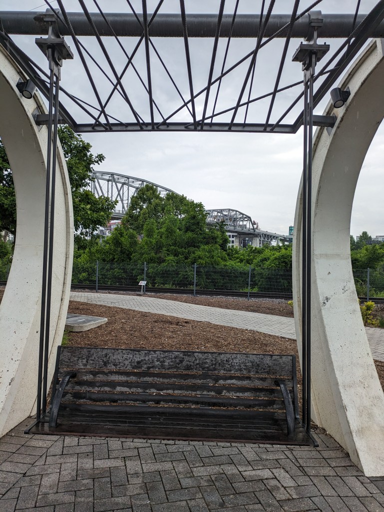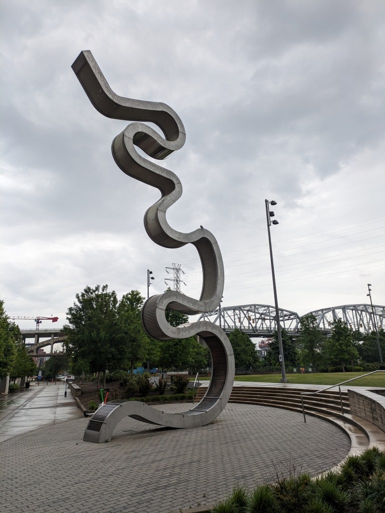 Nashville is set along the Cumberland River, and over the last few decades, the city has worked to make the riverfront more pedestrian friendly. Since its creation in the 1980s, the city is continuously adding to and improving Riverfront Park; one of the most notable additions is The John Seigenthaler Pedestrian bridge, which opened in 1998. At 3,150 feet, the bridge is one of the longest pedestrian bridges in the world. It offers a nice view of the city from its designated viewing platforms and allows people to easily access the LP stadium where the NFL Titans play. At first I thought the structure in front of the stadium was a roller coaster, and I was waiting to see it in action; however, I learned that this is actually an art installation titled “Ghost Ballet for the East Bank Machineworks” (2007) by artist Alice Aycock, who wanted to honor the history of industrial work along the river.