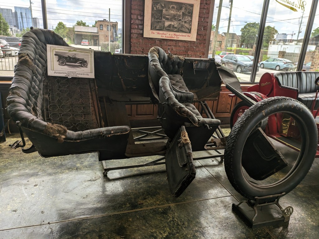 One place that not only embraces its past but makes it part of the space is the Marathon Motor Works building. Built in the 1880s, the building once housed the Southern Engine and Boiler Works, which turned to making automobiles in the early 1900s. They were one of the first manufacturers to build the whole car from design to completion. While their two models of the Marathon car were popular, due to changing hands and poor business practices, the company closed their doors in 1914. The building is now called Marathon Village and is occupied by tourist shops, unique artisans, tasting rooms, cafes, and cultural spaces. However, artifacts from the company are on display throughout the hallways: newspaper clippings, machinery, and tools have more of a presence than the stores. I enjoyed exploring the architecture of the building – both through the hallways and in the outside courtyard. Across the street, there is a small museum honoring the Marathon car, which includes four of the eight Marathon cars left in existence.