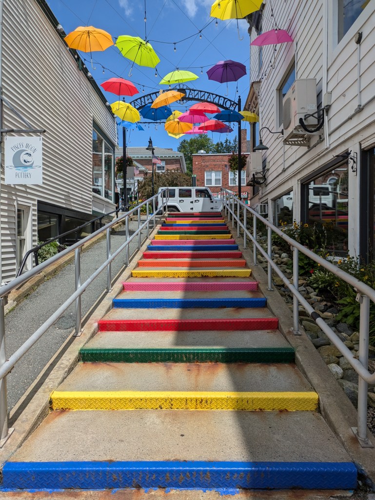Up the small hill, the main street is vibrant: many of the side streets are adorned with murals, umbrellas hang over rainbow stairs, and musical instruments – including painted pianos – welcome people to add music to the mix.
