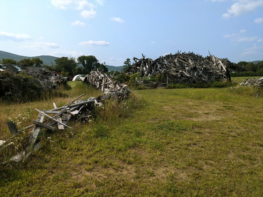I knew that the cow observation deck we saw on the way up was random, but I could tell from the online pictures that our last stop would be even more random. Living in the Post Mills airstrip, the Vermontasaurus is a 122 foot long and 25 foot tall scrap wood sculpture of a dinosaur. Brian Boland created the first dinosaur sculpture in 2010, and since then a few other smaller dinosaurs have joined the ranks. Over time storms and time have collapsed parts of the creatures, so the sculpture is continually in flux and not always recognizable as a dinosaur. The airfield also holds a piano under an awning for people to play, a Soviet space capsule, and a few small gliders that look like they are still in use. There are also supposedly more relics of balloons and medical equipment and such in the building across the field, but we didn’t venture over there this time.