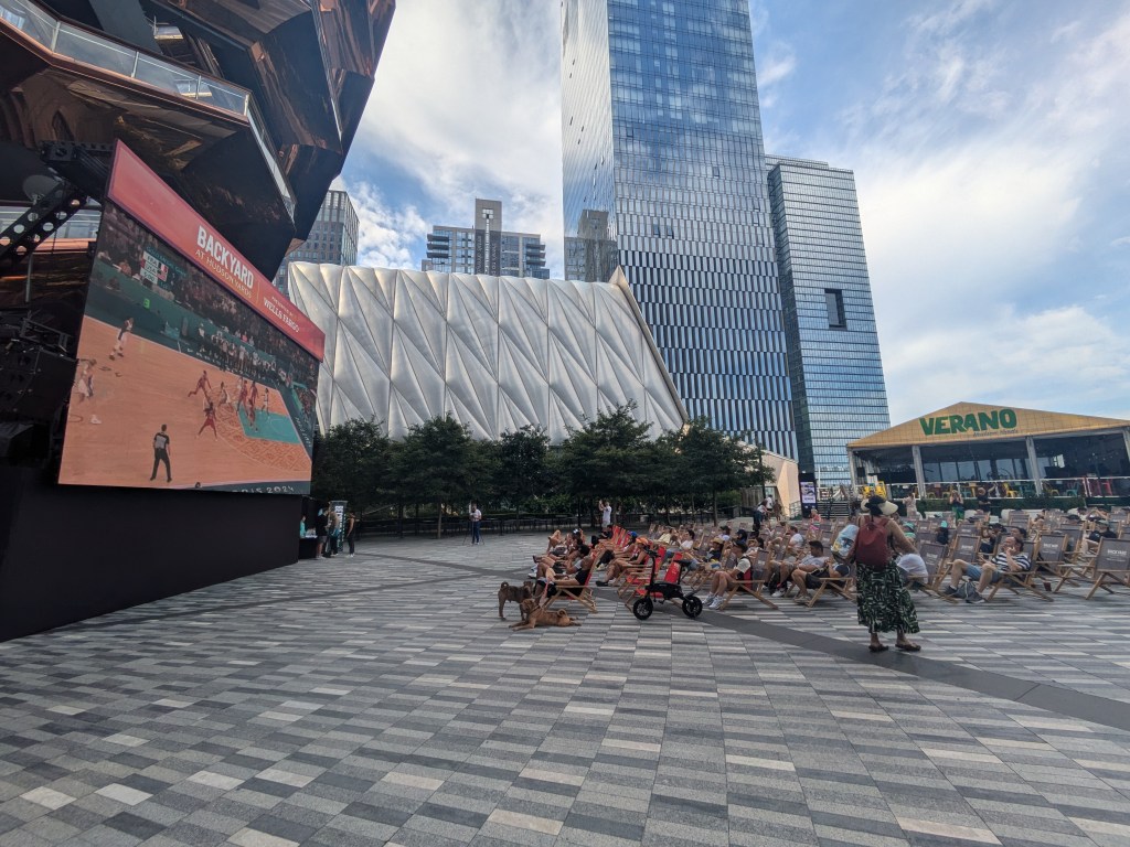 Just underneath the Vessel stood a large screen which was broadcasting the Olympics. I happened to be there during the finals of the women’s basketball game, so I grabbed one of the empty beach chairs provided to cheer along with the other spectators. Called the Backyard at Hudson Yards, it looks like this screen is a staple of this community space that hosts movie nights, other live games, yoga classes and live concerts.