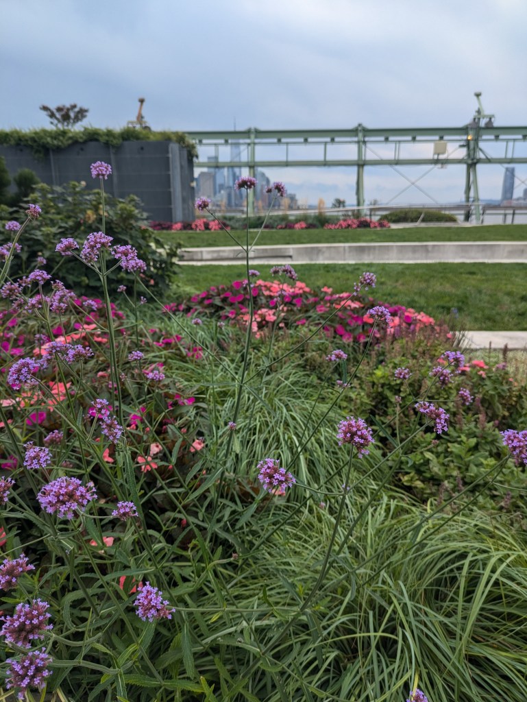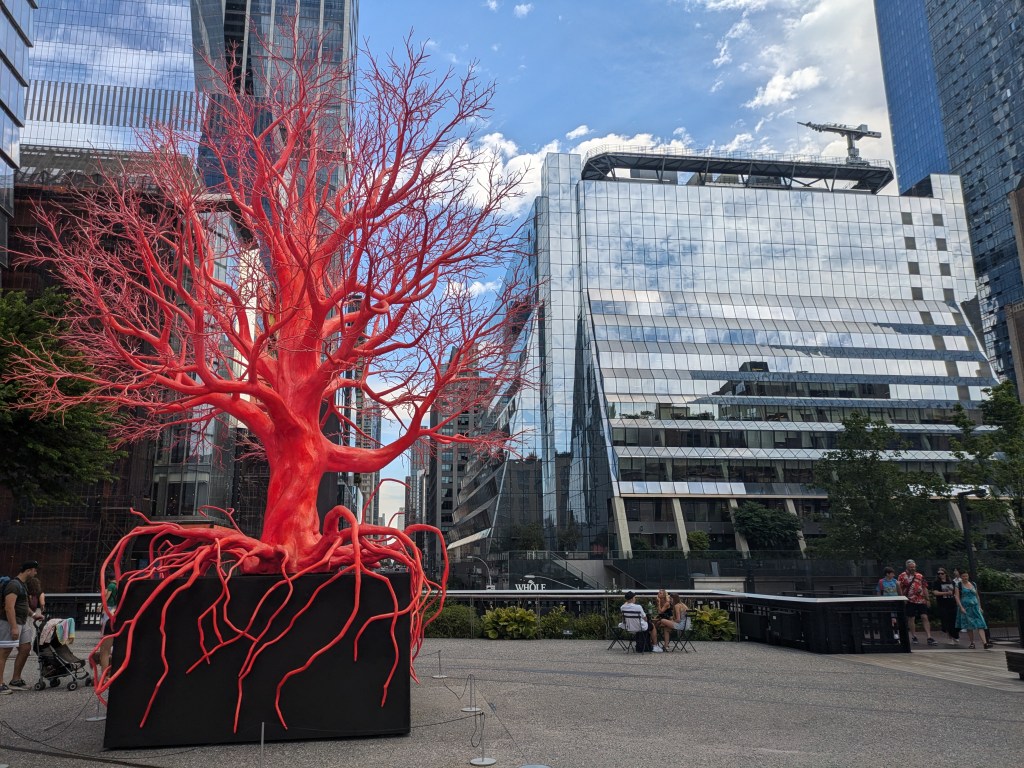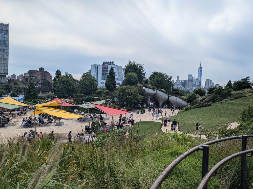 From Pier 57, Little Island is seen in all its quirky glory. Held up by 132 tall white space-shaped vessels (named tulip pots), Little Island looks like it’s floating in space. The white concrete of the tulip pots contrast with the rust color of the steel barriers and green of the landscape. Landscape architect Signe Nielsen wanted to make it look like a scene out of the Wizard of Oz, and I think that she succeeded in making me feel like I was transported away from the city. Little Island was created in the wake of the destruction of Hurricane Sandy. However, while Pier 55 has been completely rebuilt, the original pilings have purposefully been left in the water as a nod to the history of this space. After a few years of design and construction, Little Island opened to the public in 2021 as an immersive park space. A central plaza with sail shades, interactive music and art installations, a waterfront amphitheater and winding trails make up this 2.4 space. I enjoyed the experience of walking around the park; however, my plan to find a shady green spot to read for awhile was foiled as the only seating options on Little Island are the sunbaked amphitheater and the busy dining plaza. Luckily I was able to find a place to do this later in the day.