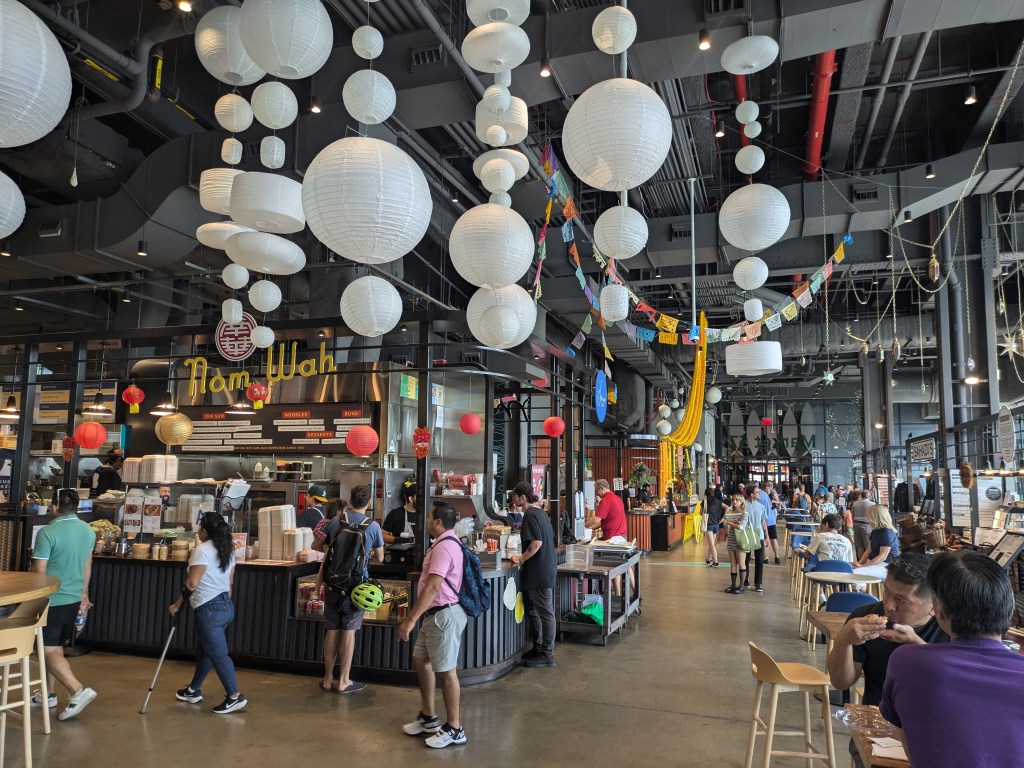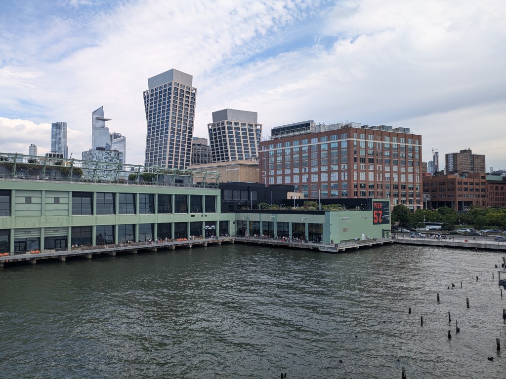 The large warehouse that houses the Market 57 is a stark contrast to the cramped space of Chelsea Market. Opened in 2023, Market 57 is run by the James Beard Foundation and focuses on healthy food. The food hall currently features a dozen kiosks with a wide variety of global cuisines. Attached to the food hall are lobby style lounging areas and access to outdoor dining along the river as well as a large rooftop patio. On a warm day, the rooftop patio provided a nice breeze from the river and some decent shade options. There was also a small green space that a few people were using as a suntanning space.