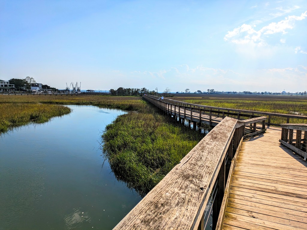 After 90 minutes or so (my white skin can’t take too much sun exposure), I was refreshed and ready for some walking. I started with a walk at the old Pitt Street Bridge. Originally built during the Revolutionary War times, Pitt Street bridge used to be the only connection between Mount Pleasant to Sullivan’s Island. The bridge closed in the mid 1940s and was turned into a fishing pier and pedestrian walkway. While it no longer spans the river, it does extend pretty far into the water, which allows for some nice views of the marshland and Charleston in the distance.