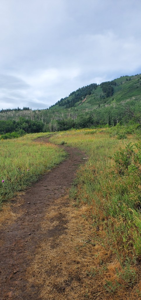 The forecast called for rain later in the day, so I made sure to get an early start for my morning hike. Because of the forecast, I looked for a hike that was short on distance, but still offered great views. The Iron Canyon trail perfectly fit the bill. The trailhead is in the middle of a neighborhood, and the trails are too steep for mountain bikers, so it’s a little less crowded than other hikes in the area. Still this short hike (2 miles, 900 ft elevation gain) provides groves of aspen birch trees, fields of wildflowers, and panoramic views of Park City and the surrounding area.
