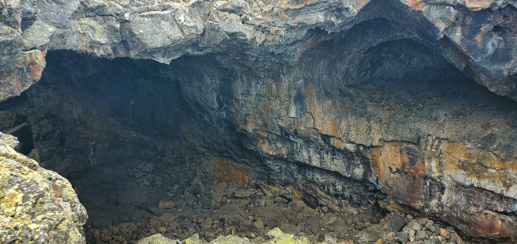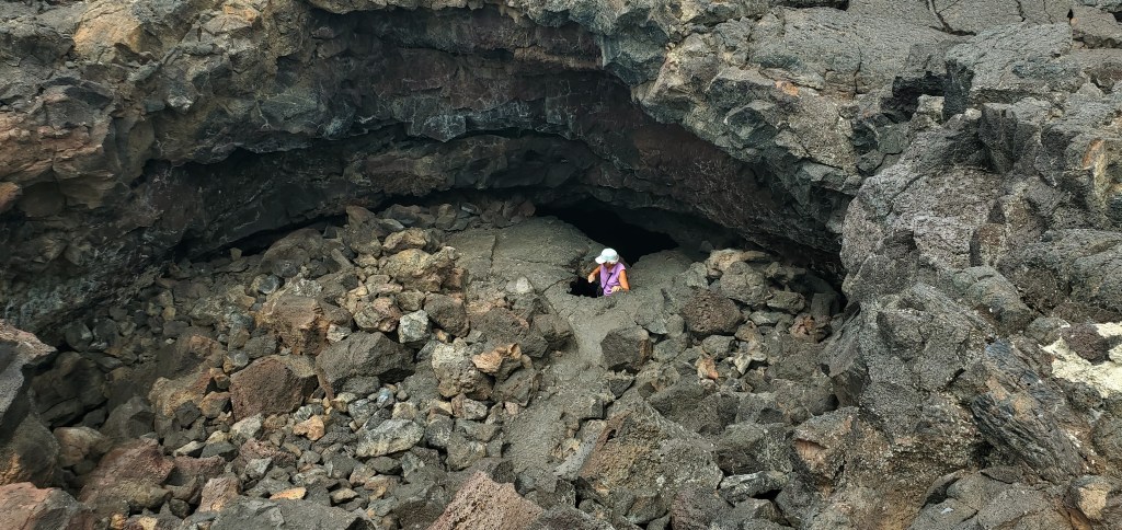 At the onset of the Caves Trail, the path traverses the stark landscape of the pahoehoe lava and doesn’t feel like it will be a relief from the heat, but as soon as I descended into the Dew Drop cave, I quickly felt the temperature drop. Dew Drop is a small cave that gives a quick glimpse into what is to come for the next cave: the Indian Cave.