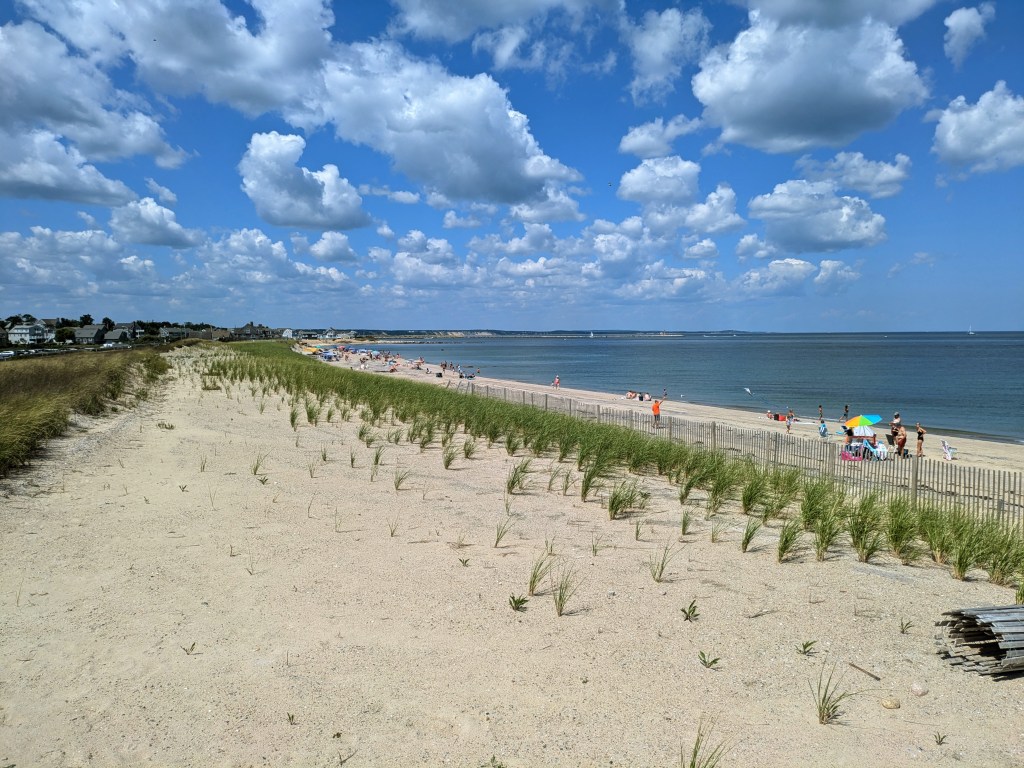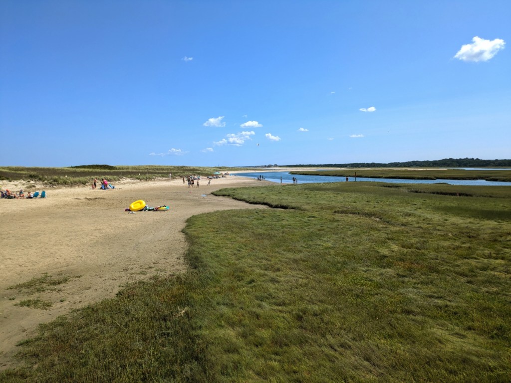 While the original Sandwich Boardwalk was destroyed by a 2022 nor’easter, the newly constructed boardwalk reopened in the spring of 2024. The 1,350 foot long boardwalk, featuring the names of local families and organizations on its planks, spans Mill Creek and the surrounding marsh lands providing access to Town Neck Beck and views of the wildlife in the area. It’s fun to watch the crabs scurry around at low tide and look for fish at high tide. During low tide, the inner part of Town Neck Beach is a great place for children to explore the marsh waters, but the tide changes quickly, and at high tide this section of the beach is fully underwater.