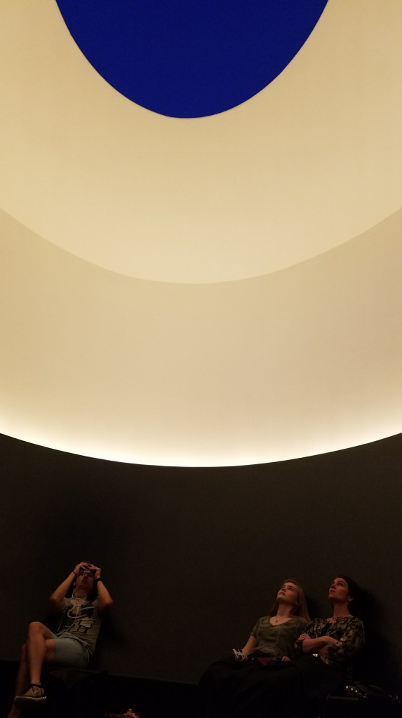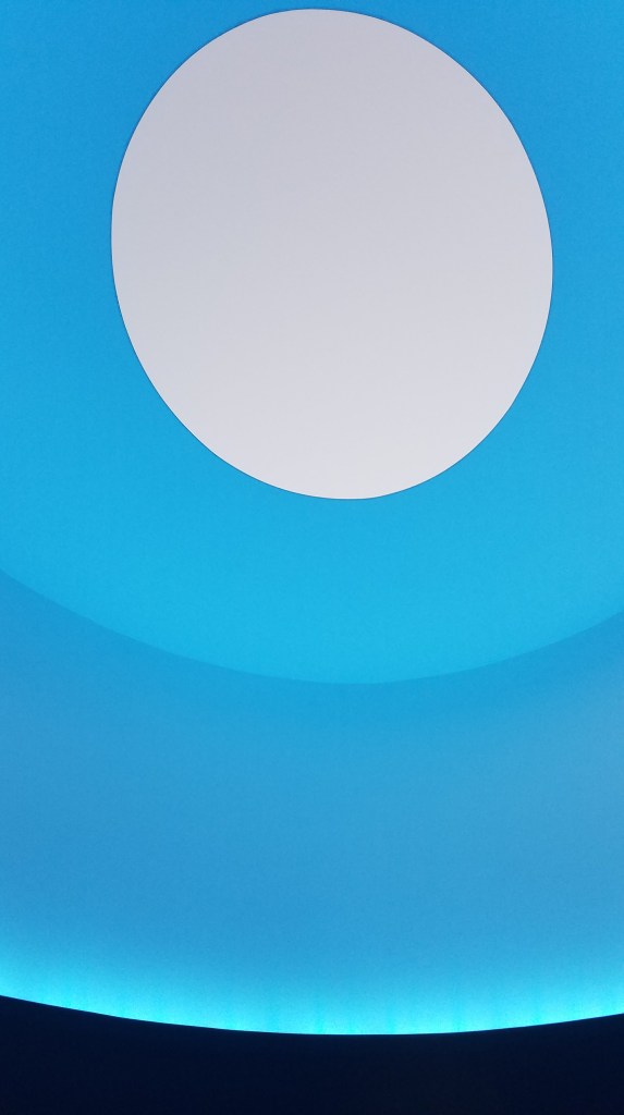 Later that night I attended a much quieter and contemplative art experience. The James Turrell Skyspace is an immersive light show – but not one with lasers and lights, instead the sky is the artist. Titled The Color Inside, the circular skyspace is plain white in the middle of the day but comes alive with color during sunrise and sunset. For about an hour during these times, the light plays off the walls and cycles through the colors of the spectrum. As the show ends, the circular opening returns to blue color of the sky as the interior space returns to white. The artist Turrell explains his vision behind the space: “I was thinking about what you see inside, and inside the sky, and what the sky holds within it that we don’t see the possibility of in our regular life.”