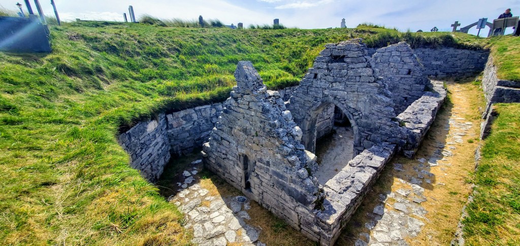 Below the castle ruins are the ruins of St. Kevin’s Church (Teampall Chaomhain). The church dates back to the 10th century, and over time the Atlantic winds have continuously buried the church in sand. Each year on June 14th – St Kevin’s Day – the locals gather to excavate the church from the winter sands. Currently, the ruins sit 6 feet below the ground.  Surrounding the church is the island’s graveyard, where gravestones from the past stand next to those of the present.