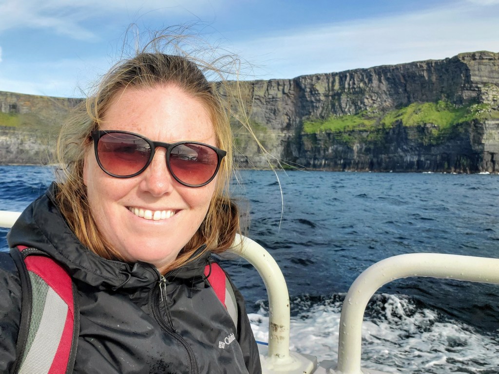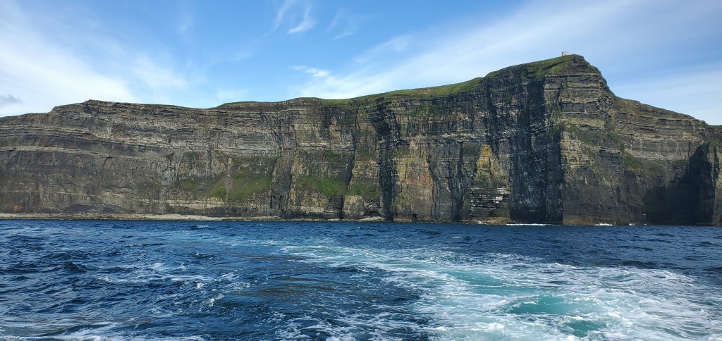 When booking my boat ride, I had the option to add on a Cliffs of Moher scenic ride, which I happily did. The one hour boat ride parallels the cliffs and puts in perspective the majesty of their height and colors.  At their highest point, the Cliffs of Moher rise 700 feet (214 meters) out of the water. The varied colors of the stone and layers of moss hint at the history of the cliffs.  My plan was to walk these cliffs the next day, so I enjoyed getting a preview of the trip and seeing them from a different perspective.
