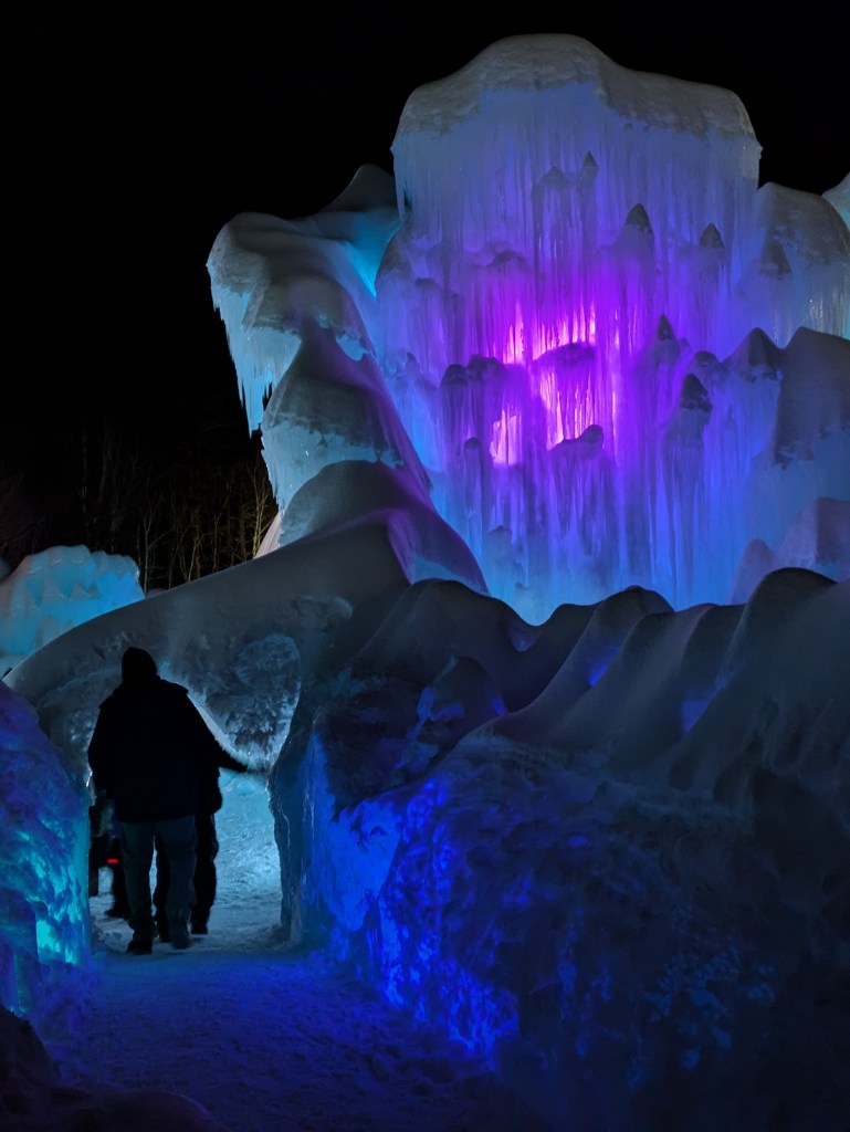 The architects design the castle to include tunnels, caves, crevasses, and slides. One of the aspects that I loved about the experience was the exploration of the castle. So many tourist destinations create a specific path for guests to walk through; however, the Ice Castles don’t. Instead, guests decide how much or how little to walk through, up, and around the castle. I enjoyed looking down on the main atrium where there was a fire spinner from one of the elevated paths, looking up at the ice stalactites hanging down from the ceilings, finding solitude in caves off to the side of the castle, watching the ice transform as the LED lights changed color, and sliding through the tunnels on the ice slides.