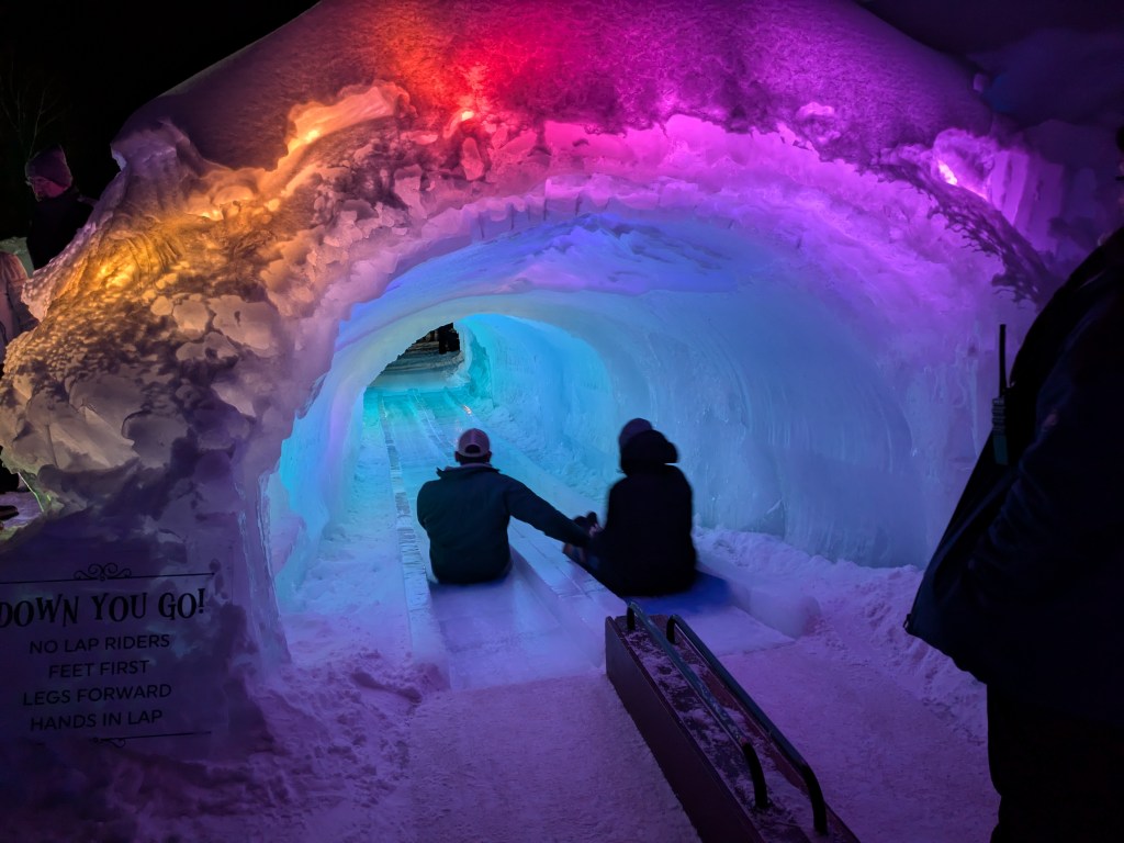 I could tell which groups had been here before as they came decked out in their snow gear with their own sleds. I would suggest following their lead with the snow attire. While only one slide required me to slide without anything underneath me, the extra layers of snow pants would’ve kept me warm in the winter night air.