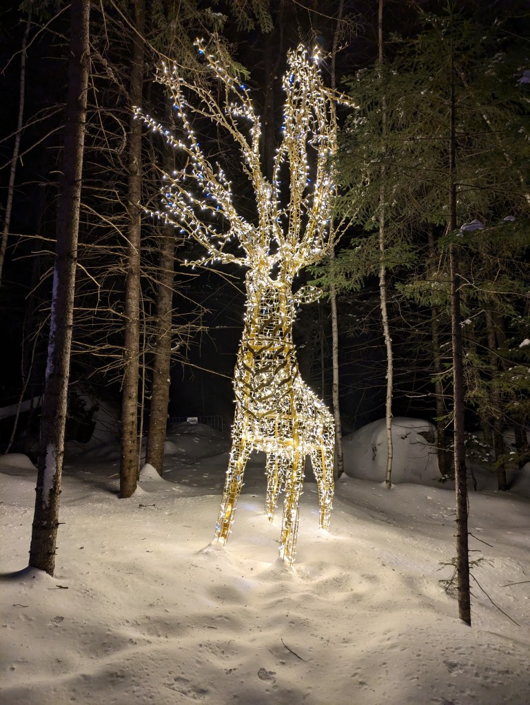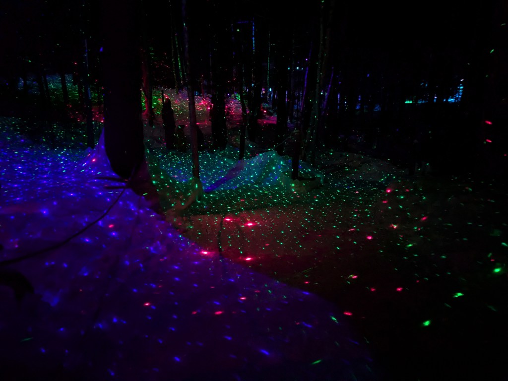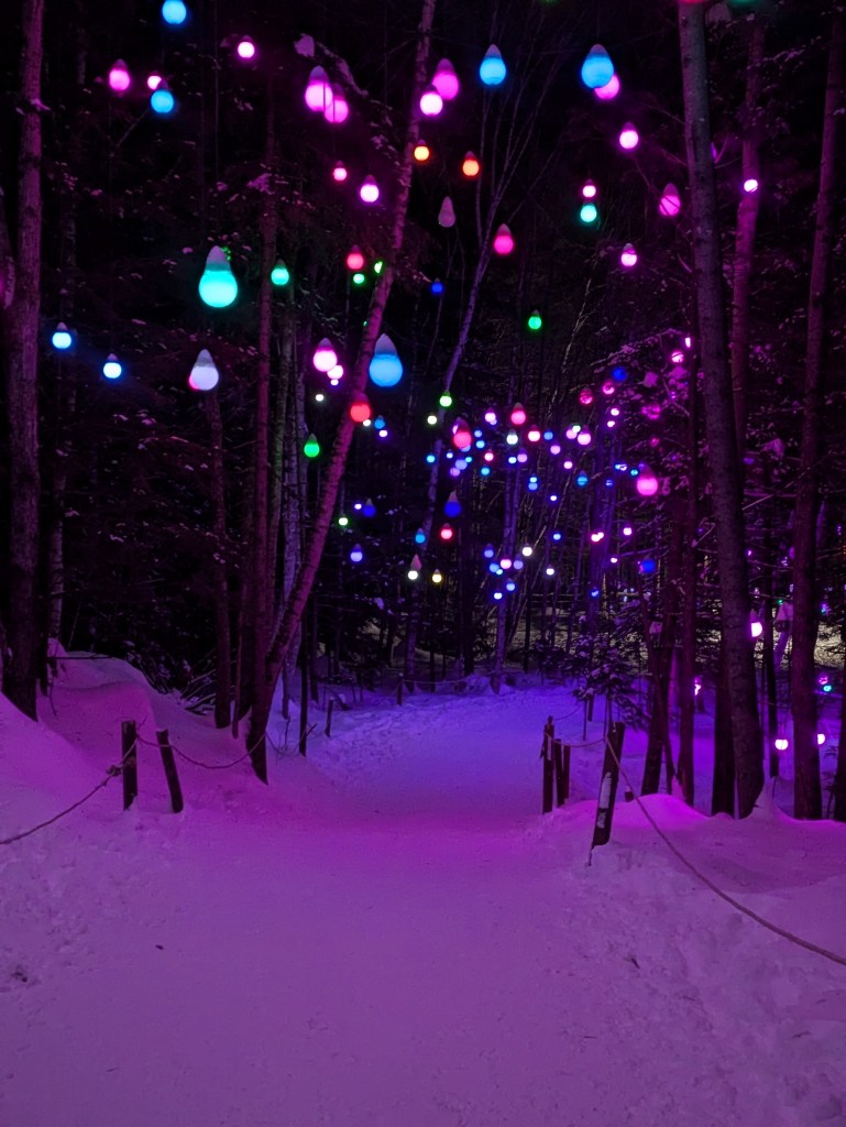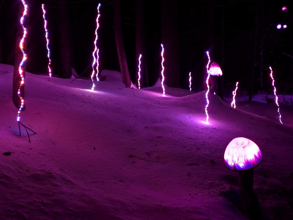 After exploring the castle and sliding down a few ice slides, I made my way over to the mystic forest walk. As this required a little walking – I think the path was about 1/4 mile with some mild elevation – and was set behind the ice castle, it was a chance to get away from the crowds. The forest walk meandered through a collection of varied light displays. From lit up animals to fairy houses adorning the tree trunks, I enjoyed immersing myself in each unique atmosphere.