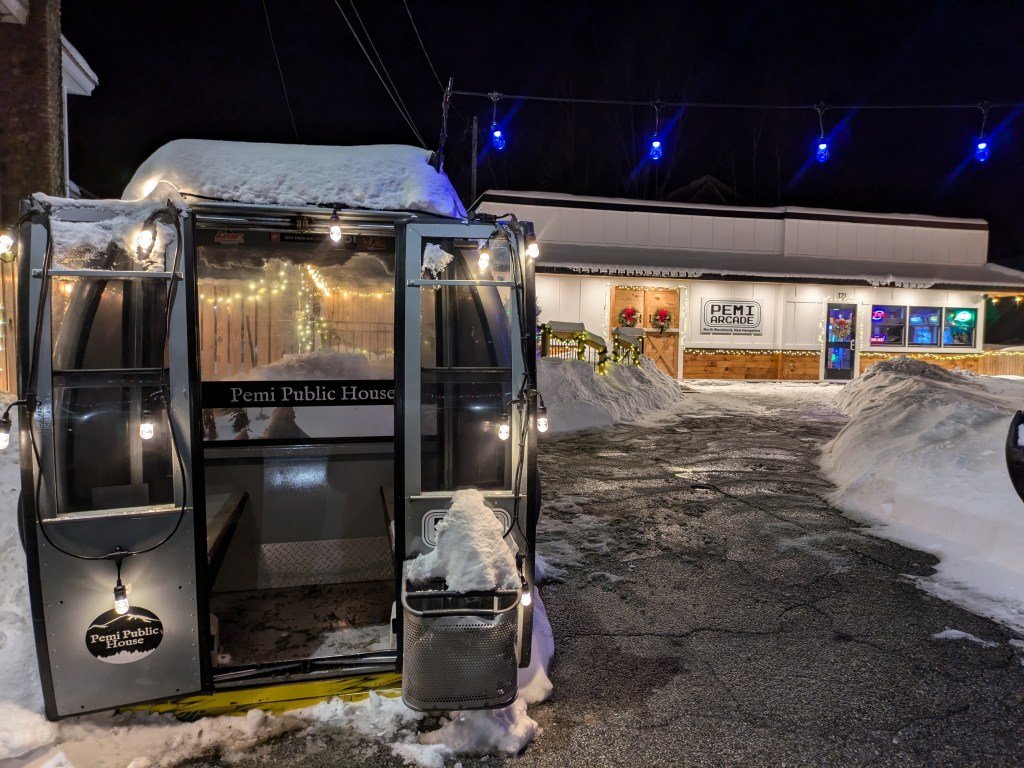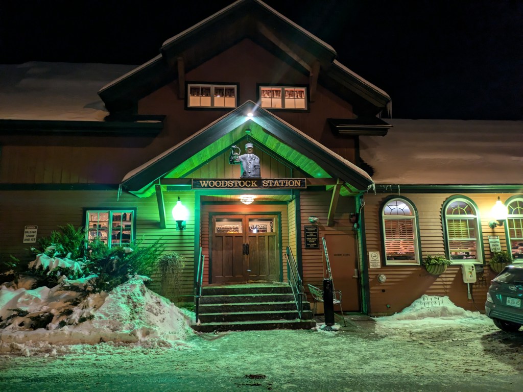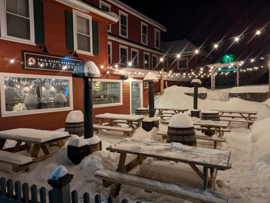 The Ice Castles offers some food and drink options, but I opted to check out downtown North Woodstock for a warmer and more relaxed experience. At almost 7pm, I was surprised to find that many of the stores along main street were still open, so I was able to check out a few cute tourist shops before heading over to Twin Barns Brewery for some live music and BBQ. The vibe of North Woodstock seems low key and local. People were social, cars slowed to let people cross, and even with the snow, parking was easy.