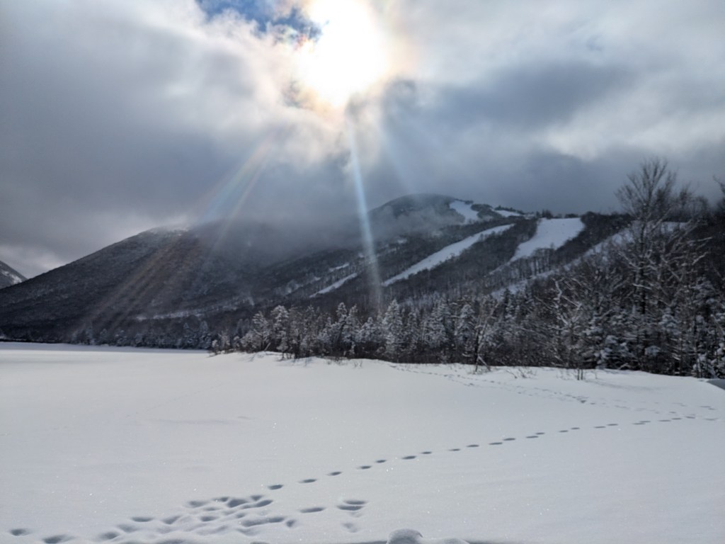 Besides Loon Mountain, Franconia Notch State Park draws tourists to the area. While most people visit here in the warmer months, I still enjoyed some beautiful scenery and walks during my winter visit. I can imagine that during the summer Echo Lake is a popular swimming destination for hikers in the area. In the winter, it was a peaceful frozen expanse that gave me views of skiers descending Cannon mountain and the surrounding White Mountains.