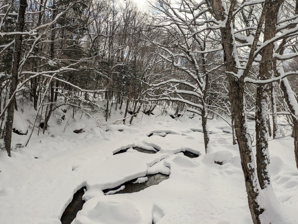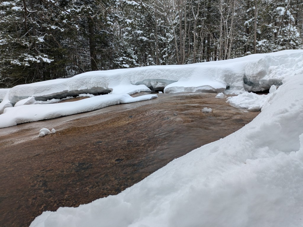 Soon after the covered bridge is Table Rock. Much of the large smooth was covered with snow, but sections peaked out, and I enjoyed watching the water flow over the rock and back under the snow layers.