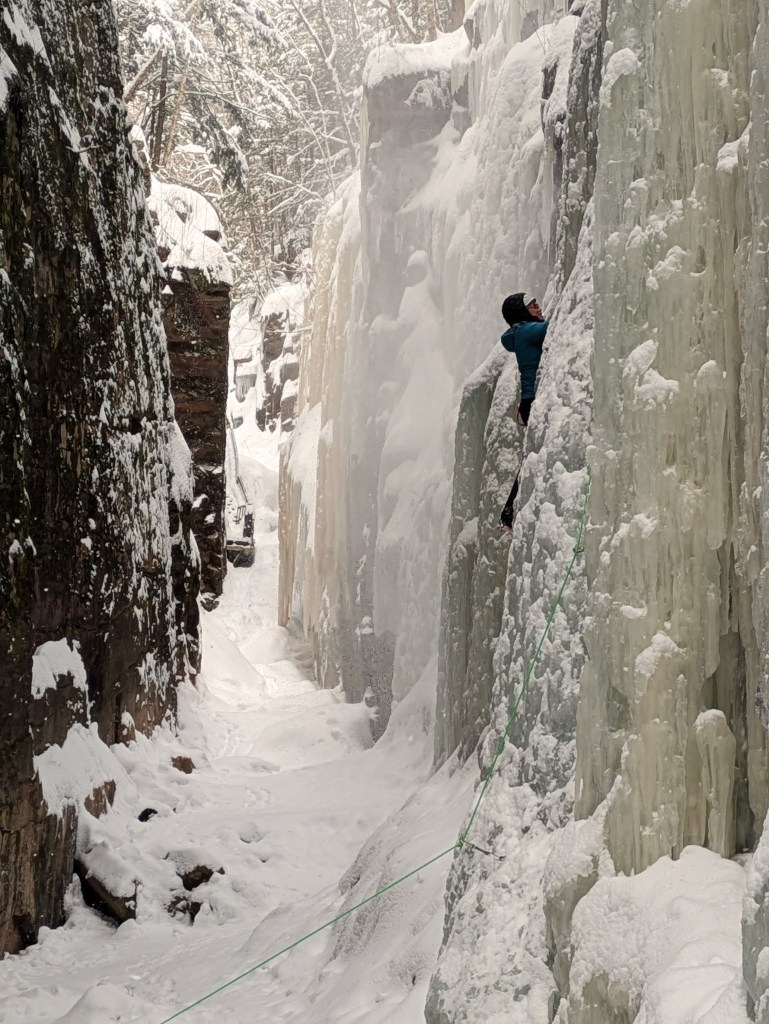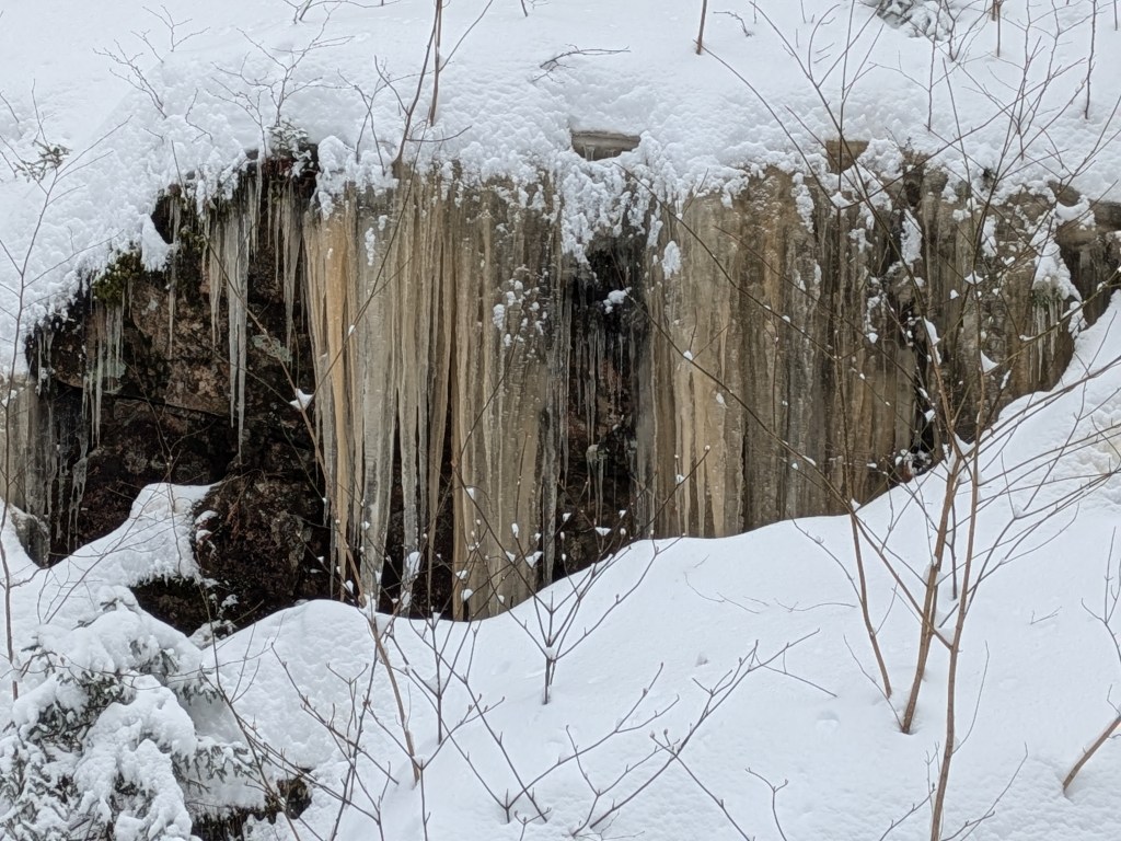 From here it was a short distance to the gorge. While the boardwalk is removed and hiking prohibited in the winter, the path does go far enough into the gorge to take in the frozen waterfalls of ice. The gorge does allow for ice climbers, and I enjoyed watching a couple navigate the ice flow to the top of the cliff ledge.