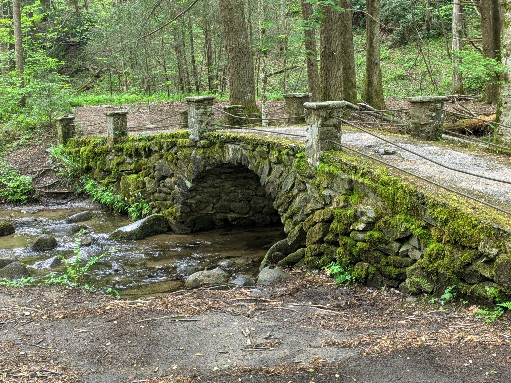 To the right of the path is a more magical relic. Nicknamed the Elkmont Troll Bridge, a small stone bridge traverses a creek in the middle of the woods. The bridge is adorned with short stone pillars and a wire railing, which I find hilarious since the bridge is so short that you can pretty much step onto the bridge from the side.