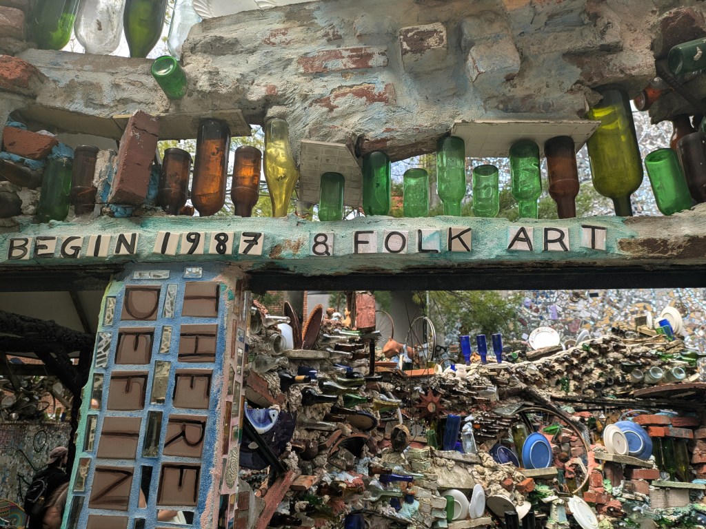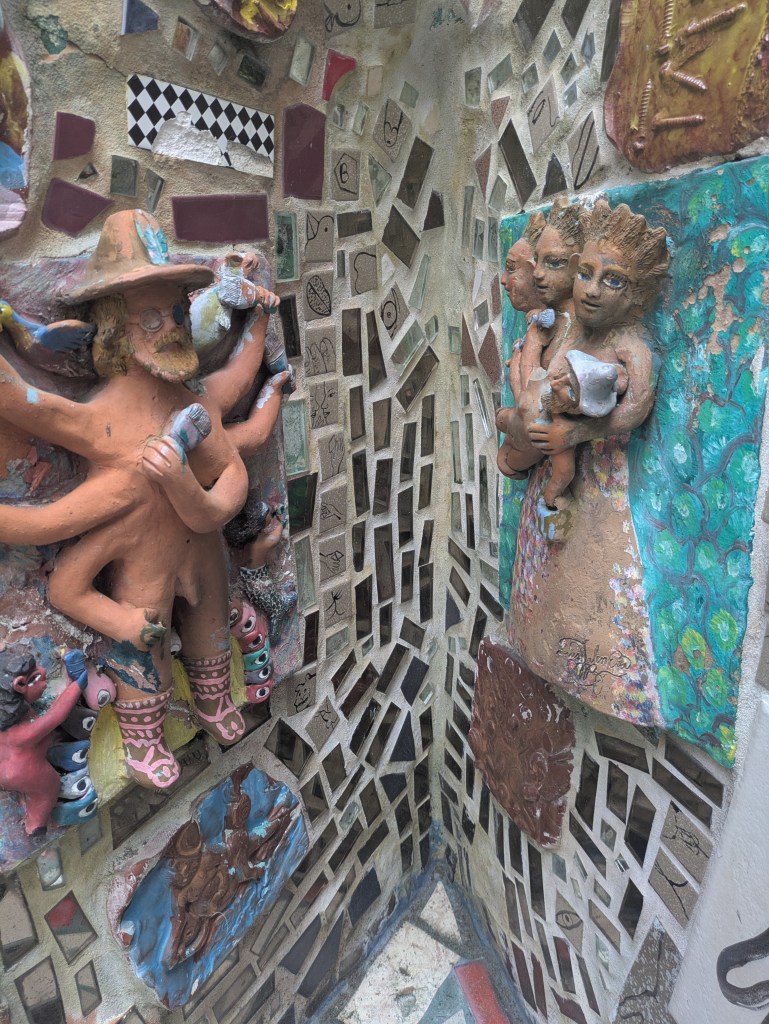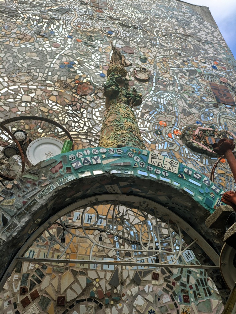 Starting in 1994, Isaiah Zagar began transforming a vacant lot into what is now the heart of his masterpiece – Philadelphia’s Magic Gardens. Here, he not only covered the existing walls with mosaics, but created a maze of tunnels, towers, and small rooms. From afar, the reflected light from the mirrors and the brightness of the colors blind you to the intricacies of the pieces. With closer inspection there are some unusual motifs in his work. The space even offers a scavenger hunt to encourage people to stop and take a closer look.