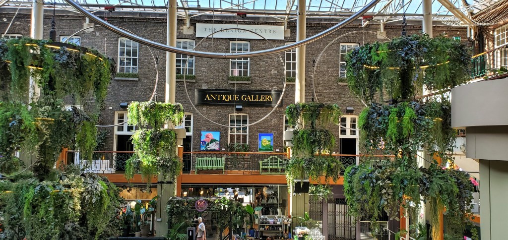 While I don’t usually go to indoor shopping malls during my travels, I was drawn to the flower covered multitiered facade of Stephen’s Green Shopping Centre. Inside this greenhouse designed space is a three story atrium. The architectural details of the building, hanging planters, and the ceiling were beautiful and many of the vendors matched the building with well curated and laid out wares. I enjoyed walking around and window shopping.