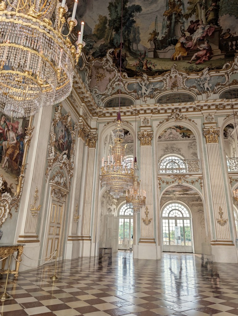 For 10 Euros, I checked out the 2nd floor palace rooms. The first sight of the Great Hall was breathtaking. Bright light filtered through the large arched windows at either end of the hall. Colorful frescoes decorated the ceiling and walls and large crystal chandeliers glittered in the light.