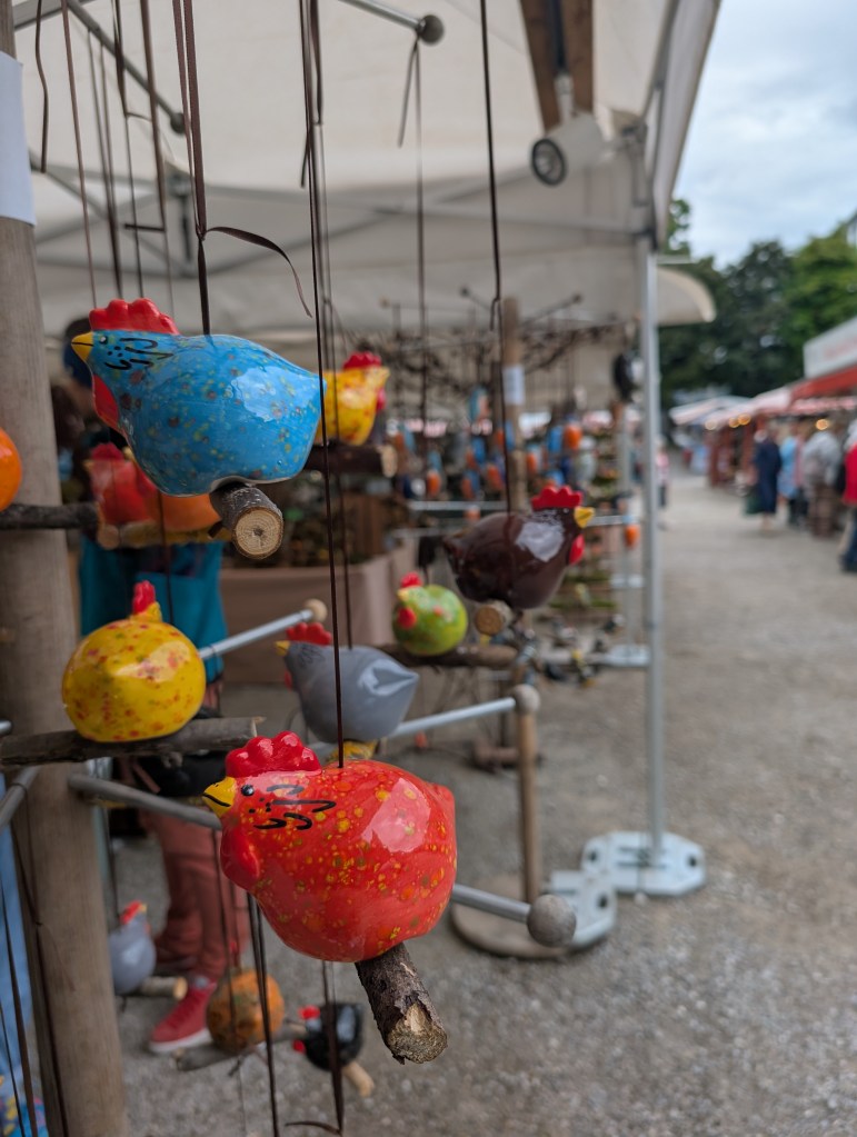 With over 250 merchants, the fair did seem to have it all. One section felt like any other carnival I’ve gone to with rides and typical carnival food, but on the other side was a maze of stalls offering everything from antiques to garden decorations, pottery to kitchen gadgets, mead wine to grilled fish, and everything in between. One of the things I have enjoyed about Munich is the use of glass containers. Even at a fair, beer and wine are served in glass containers. Despite the festival environment, people seem more civilized than I’m used to, and I enjoyed that vibe.