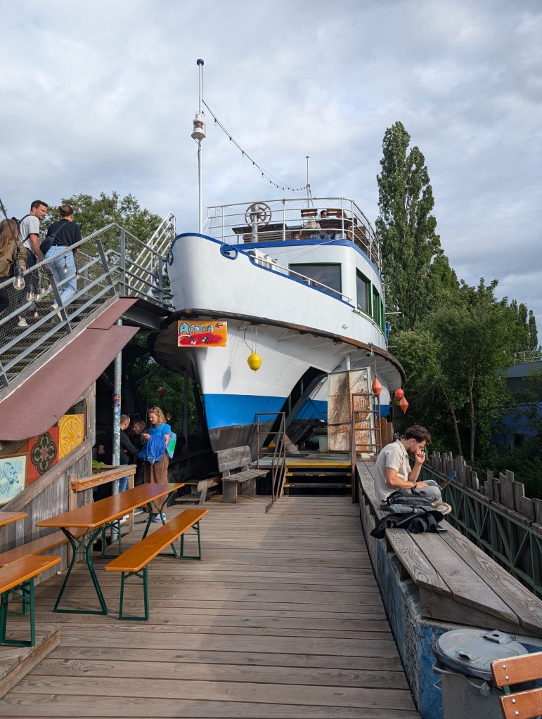 From here, I made my way over to two unique spaces. The first was Alte Utting. I had seen the pictures of this boat bar perched atop a bridge online, but I didn’t realize that the retired 1950 steamer MS Utting is only one part of this unique sprawling space. Every staircase or corner I took, I found another nook to settle into. On site are at least four different food stalls serving everything from African food to crepes, and throughout the space are a series of bars to pick up a drink. I visited on a Thursday night where they also had live music and a panel talk (since I don’t speak German, I couldn’t figure out what the talk was really about).