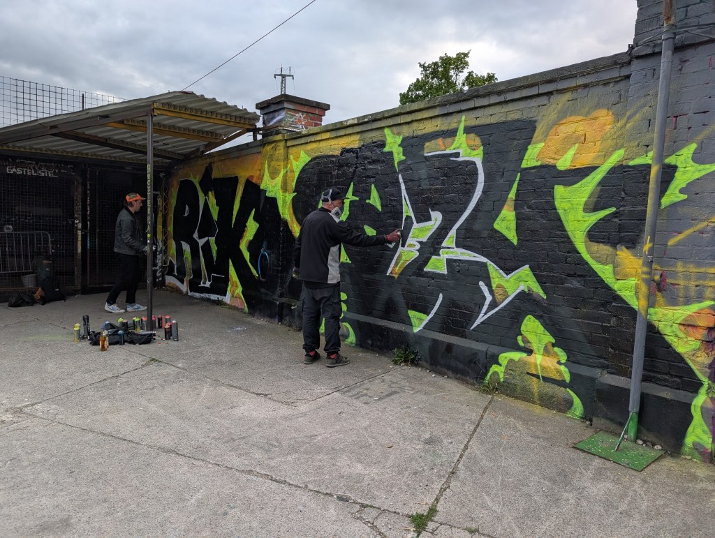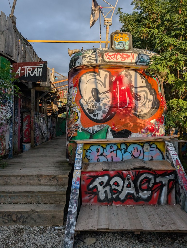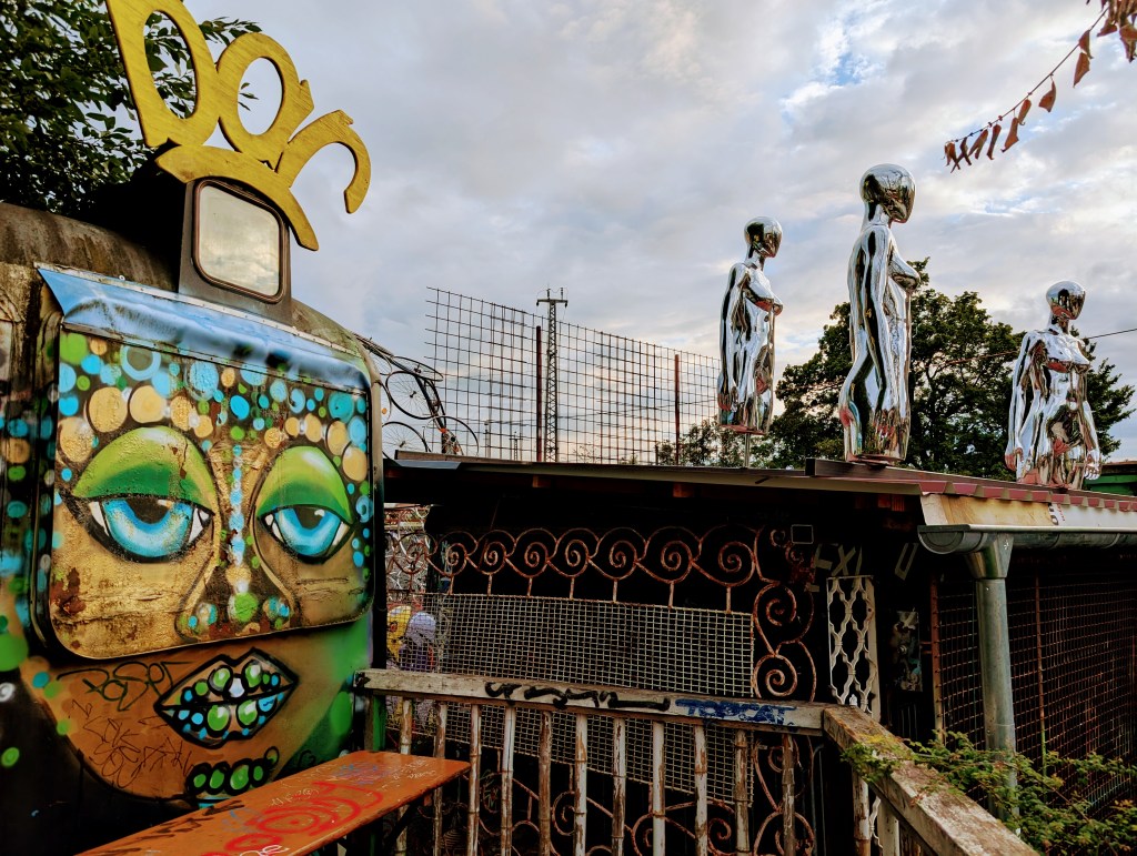 Just around the corner is the Bahnwaerter Thiel. I love an alternative art scene, and this graffiti decorated mix of shipping containers and old railroad cars definitely fit the genre. Open since 2015, it seems that the space is whatever the people who frequent it are inspired to add – from a container garden to metal sculptures to a new graffiti mural being painted as I watched. Like Alte Uttig, there are a few food stalls, bars, and live performances on site.