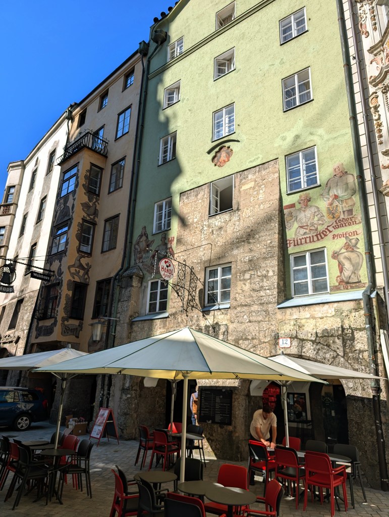 Directly across the river from the fair are the colorful houses of Innsbruck. These houses date back to the late 1400s. Because Maxmilian I was worried about fire, he instituted new building regulations that required stone buildings to replace half-timbered ones. The construction of stone allowed people to experiment with decoration – including new colors and frescos.