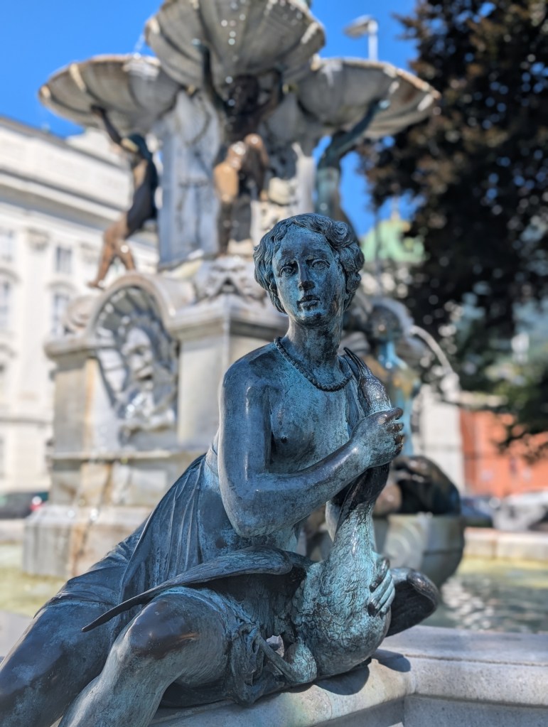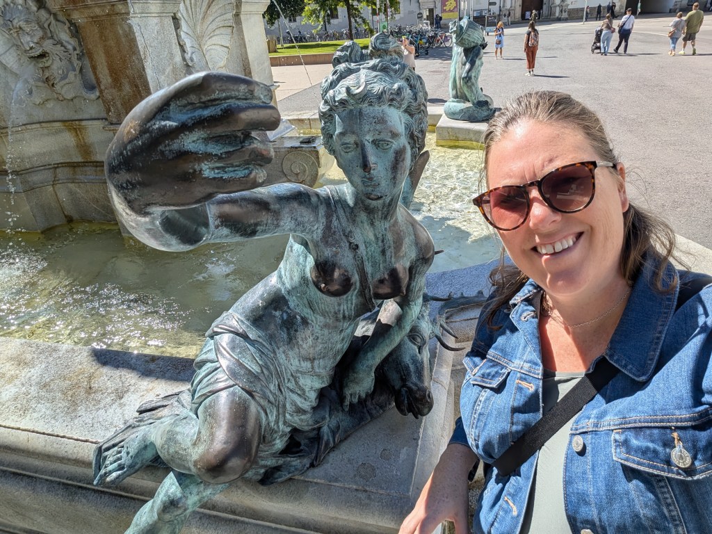 Walking back to my lodging, I passed the massive white facade of the Hofburg Palace with a small city square across from it. I was drawn to the Leopold fountain with its series of figurines posing on its corners; one of woman reminded me of the Selfie pose, so I couldn’t help but follow her lead.