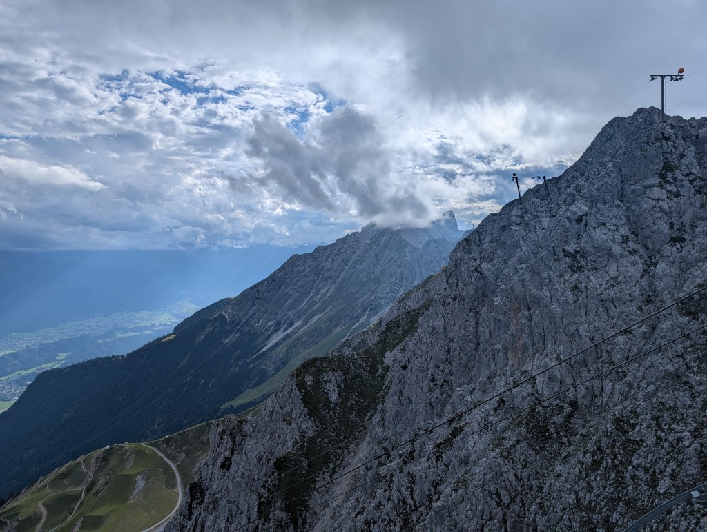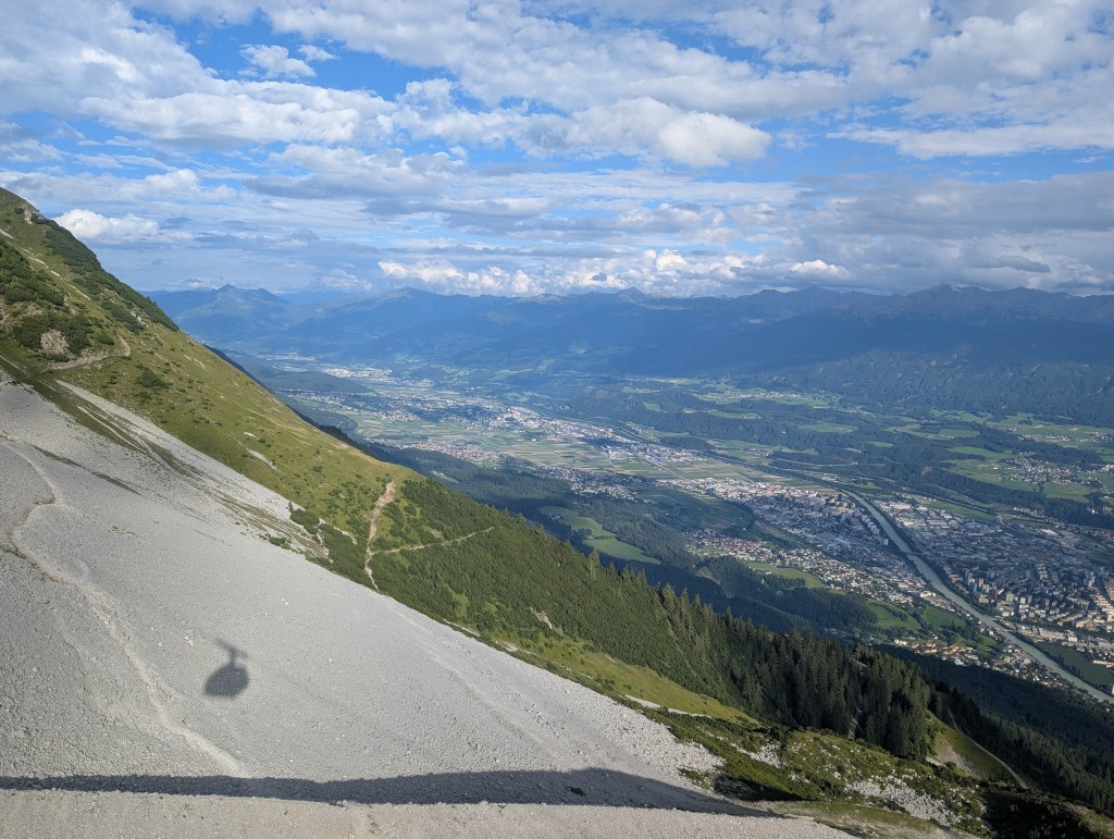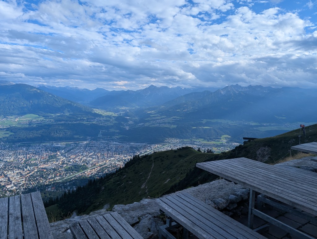 We took the last cable car down from Hafelekar to the next stop, Seegrube, where we had another 25 minutes to enjoy the views here before again taking the last cable car down. This stop is more built up with a restaurant (too late for us to partake), a playground, scenic seats, and an interpretive trail.