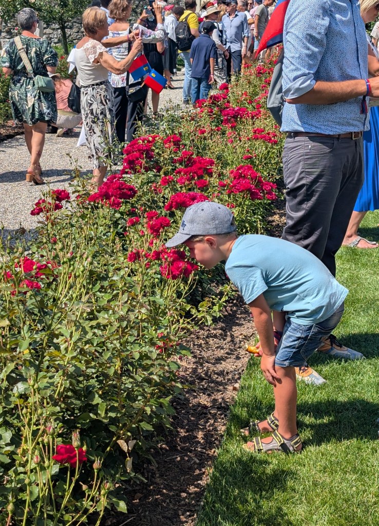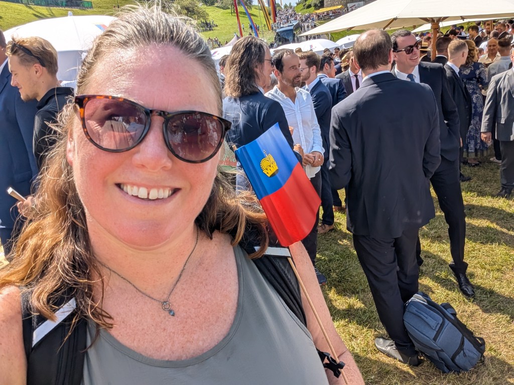 Before I came, I had seen some videos and posts about this National Day, so I knew that I would need a ticket to meet the royal family; however, I thought that I could watch the ceremony without a ticket, and I decided that the climb would be worth experiencing some of Liechtenstein’s traditions (even if I didn’t understand the language). Unfortunately, I found out when I reached the top that a ticket was needed to enter the grounds, so back down the hill I went. Just as I was reaching the city center, a local asked me if I needed a ticket to the castle festivities. After only a short hesitation where I thought about the sweaty trek I would have to make again, I eagerly accepted the offer. So, back up the hill I went. Through all of this, I missed the ceremony – not because of the extra hike, but because it started an hour before (10:30 am). Still, the experience of being surrounded by Liechtenstein’s citizens & political leaders was worth the journey.