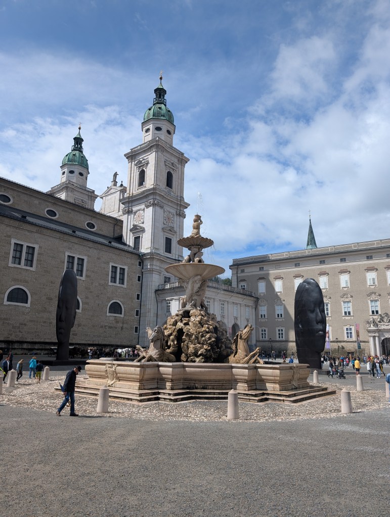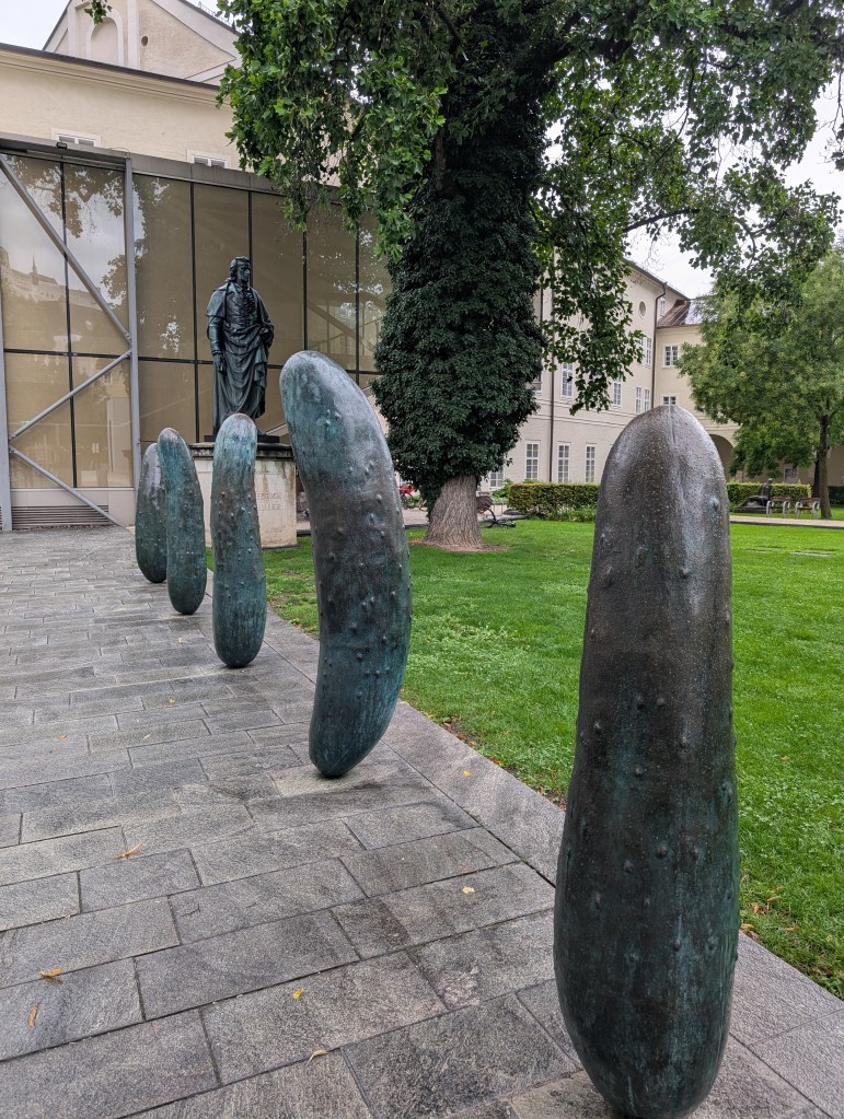 Just outside the Salzburg Cathedral is the 16th century Residenzplatz. I visited in the summer of 2025 when five massive sculptures (Secret Garden by artist Jaume Plensa) joined the large baroque fountain at the center of the square. Both of these installations commanded attention, and the juxtaposition between the two created a conversation between the past and the present. Throughout the city, thirteen installations that make up the Walk of Modern Art do the same: gherkin pickle sculptures aligned with a statue of Fredrich Schiller, a man standing atop a golden sphere in the foreground of the St. Peter’s abbey.